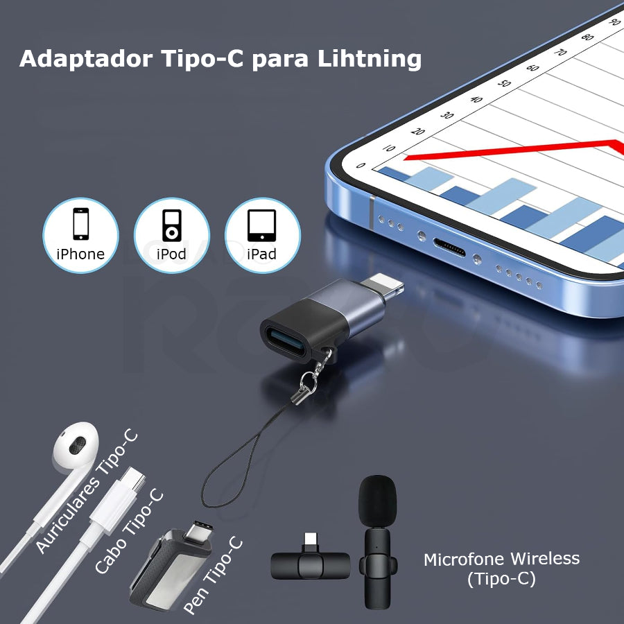 Com o adaptador Tipo-C para Lightning consegue conectar dispositivos externos, como auriculares, cabos de carregamento, microfones, que tenham saída Tipo-C.