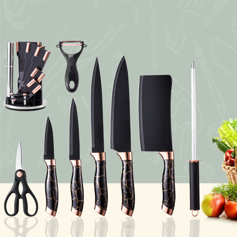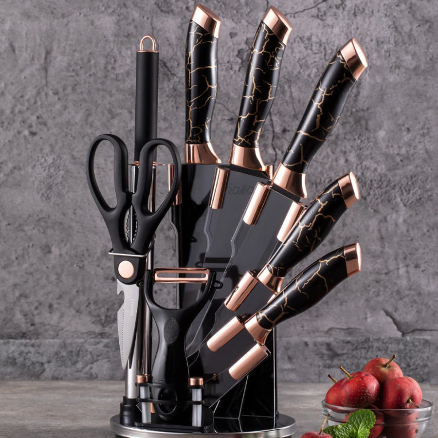 O conjunto inclui uma variedade de facas e utensílios, face de cutelo, faca de cozinha, faca para pão, faca universal, faca de fruta, um afiador de facas, tesoura e descascador e ainda um suporte para ficar tudo organizado.