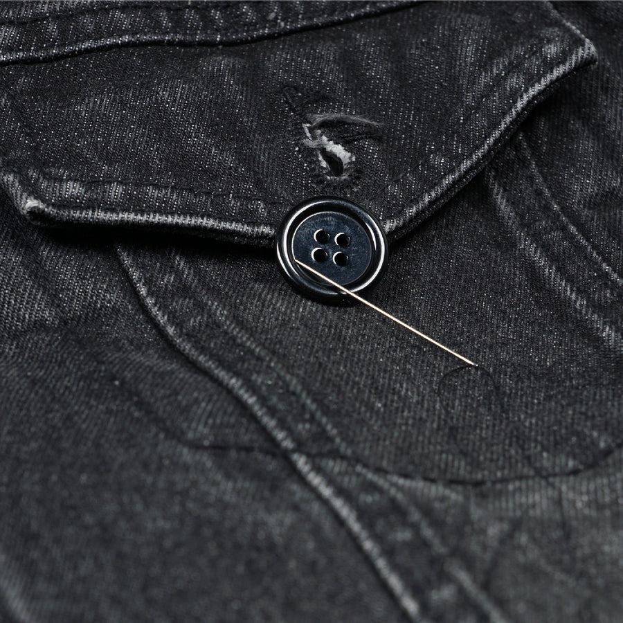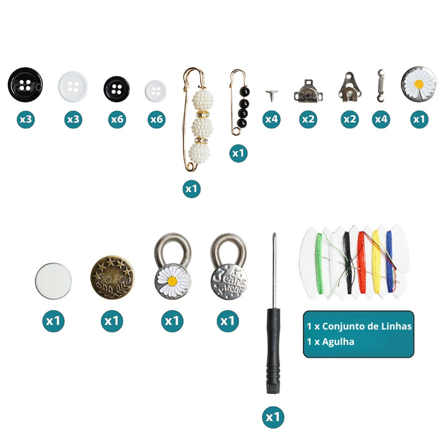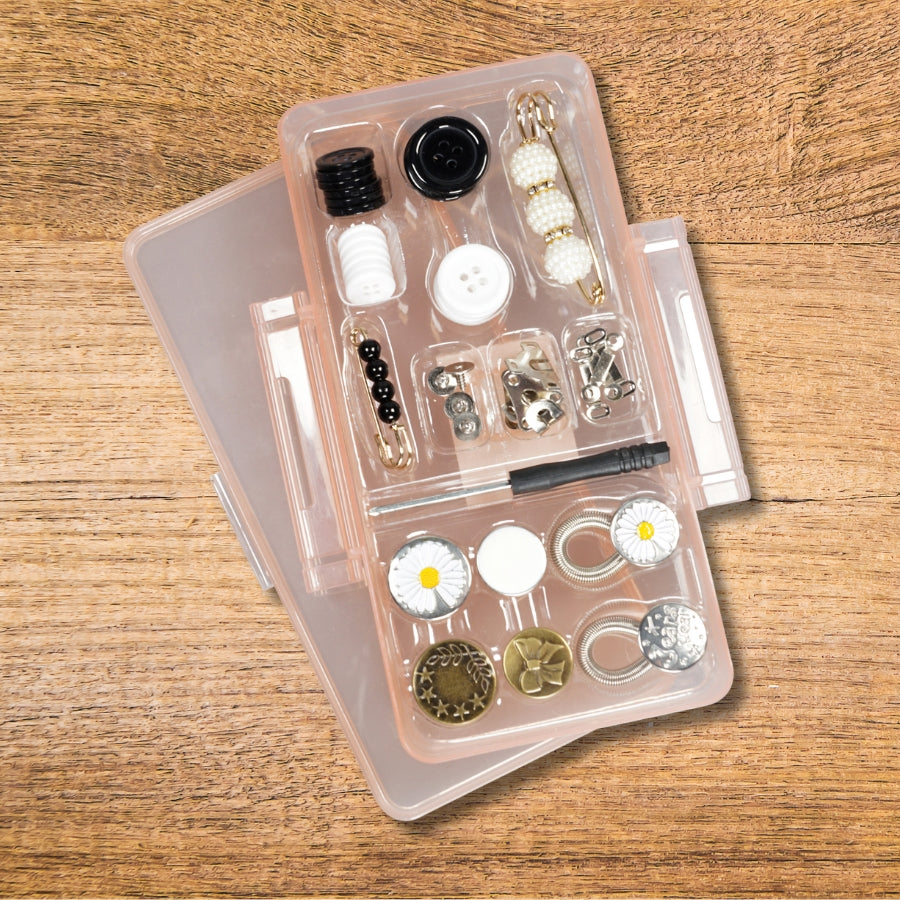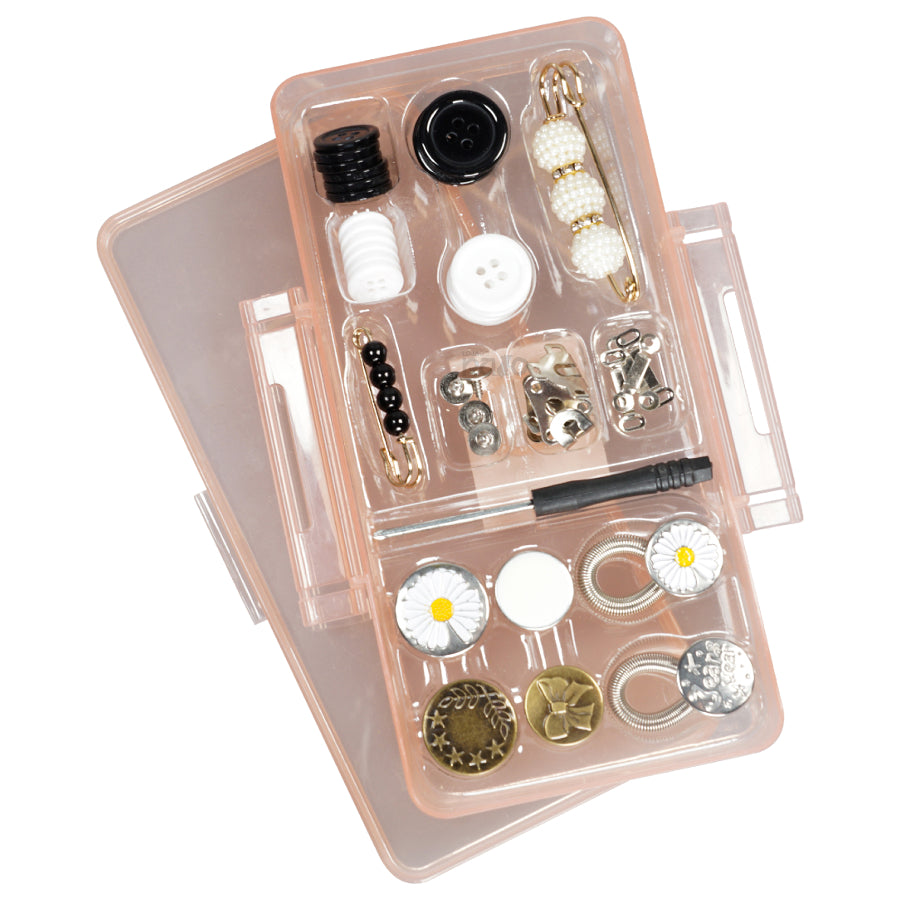 Inclui tudo o que precisa para arranjar ou substituir os botões das suas calças preferidas ou de outras peças de roupa.