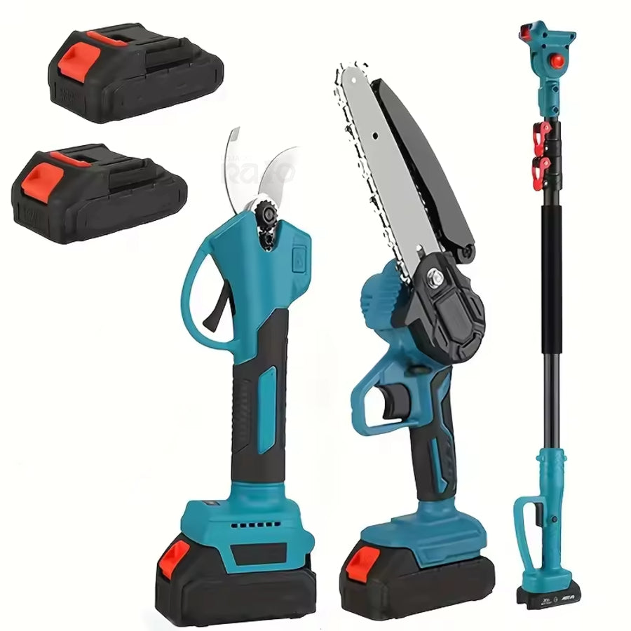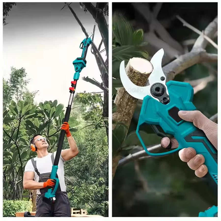 Um conjunto prático e versátil para poder utilizar em trabalho ou em casa. Contém uma tesoura de poda elétrica, ideal para cortar paus finos, e pode ser utilizada em conjunto com o cabo para alcançar ramos mais altos.