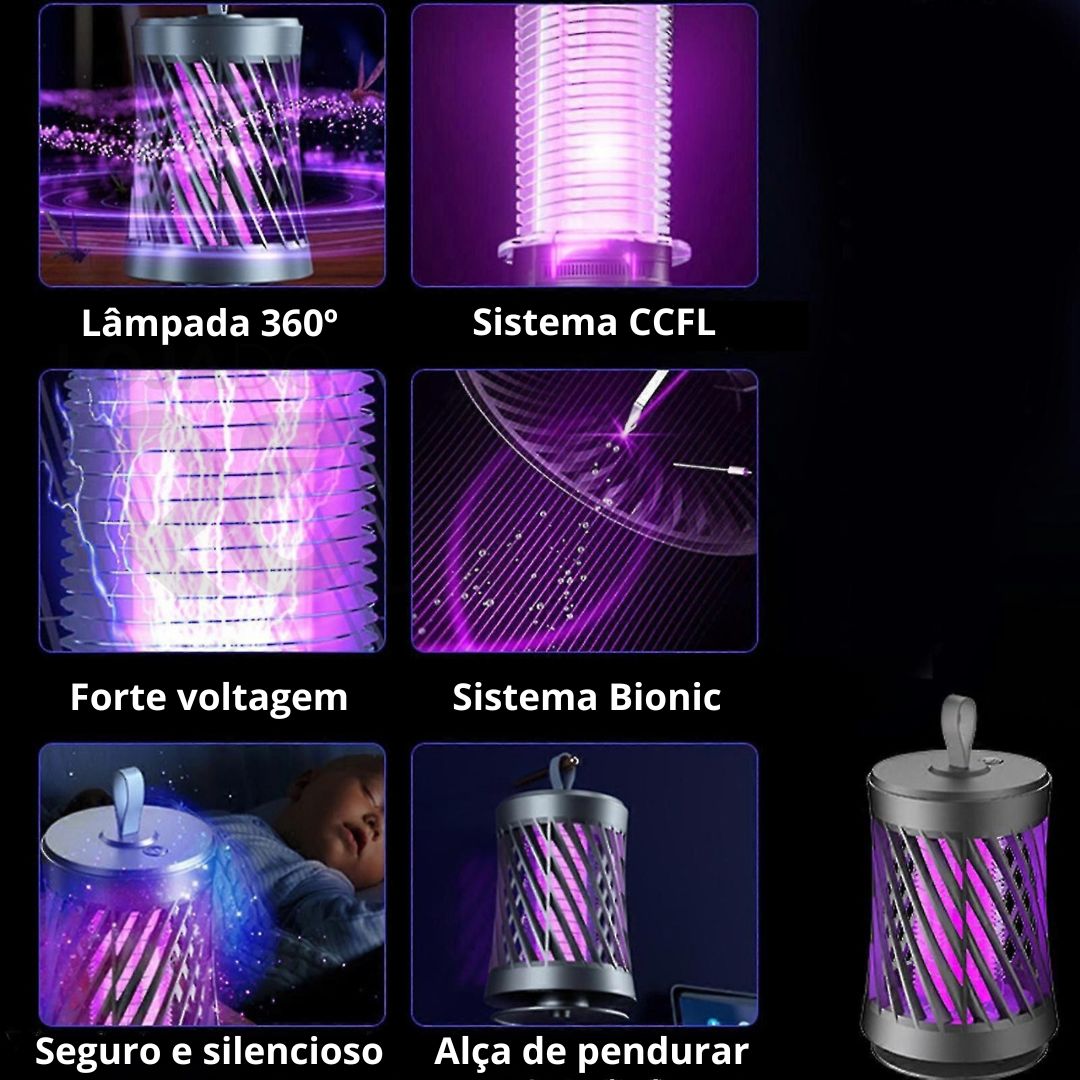 Emite luz UV que atrai insetos por 360º — eles voam direto para dentro da lâmpada.