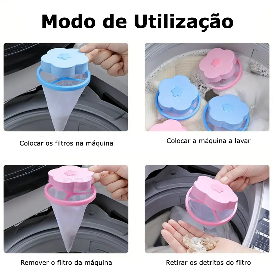 Com o filtro para colocar na máquina de lavar roupa nunca mais se terá de preocupar os detritos na roupa. Basta colocar os filtros na máquina, colocá-la a lavar e quando esta acabar retirar o filtro e ainda o lixo que estiver na rede.
