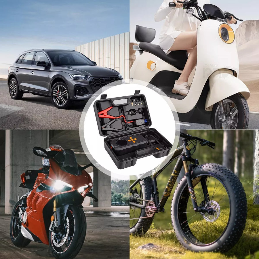 Permite-lhe encher os pneus do carro, acionar o funcionamento do carro, carregar dispositivos móveis e ainda ligar a luz LED para utilizar em situações de emergência.