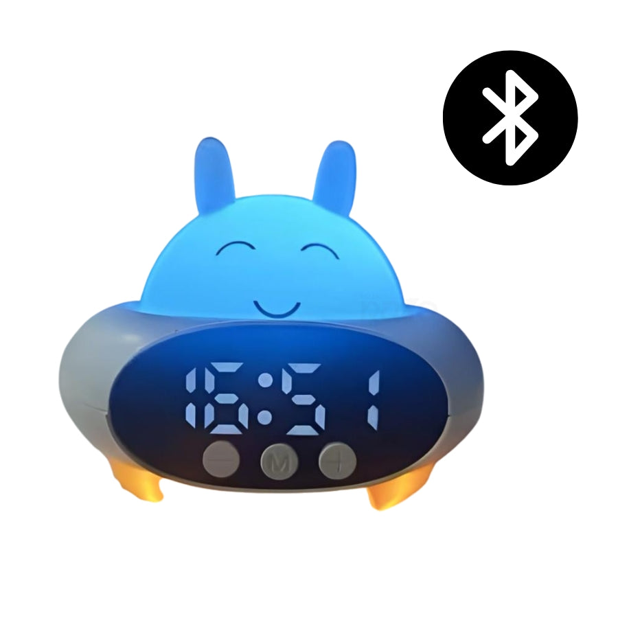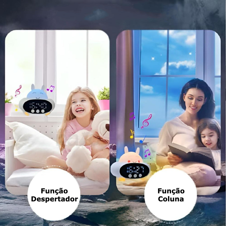 Este adorável despertador combina luz noturna ajustável, coluna e funções inteligentes para uma experiência prática e encantadora.