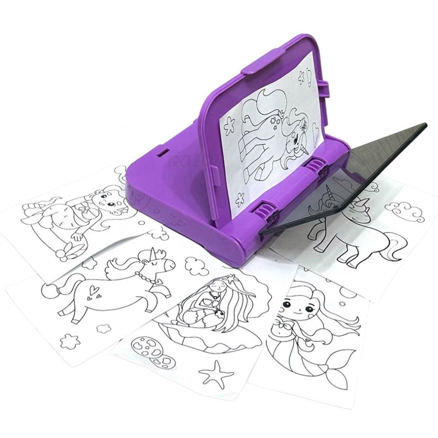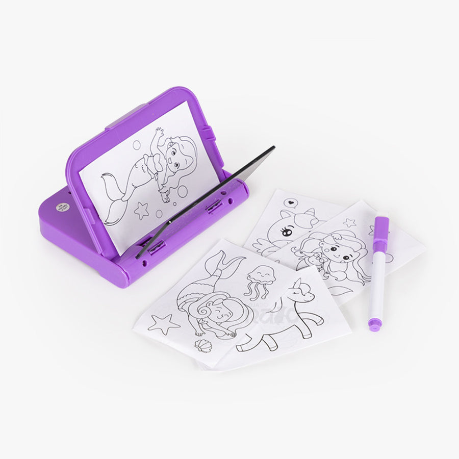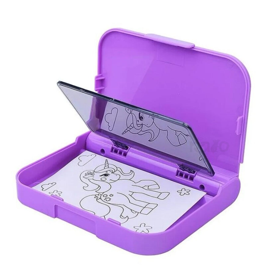 Projetor de desenho mágico, pensado para ensinar os mais pequenos a desenhar de forma fácil e divertida. Projeta a imagem de uma ilustração sobre uma superfície transparente, permitindo que as crianças tracem o desenho refletido.