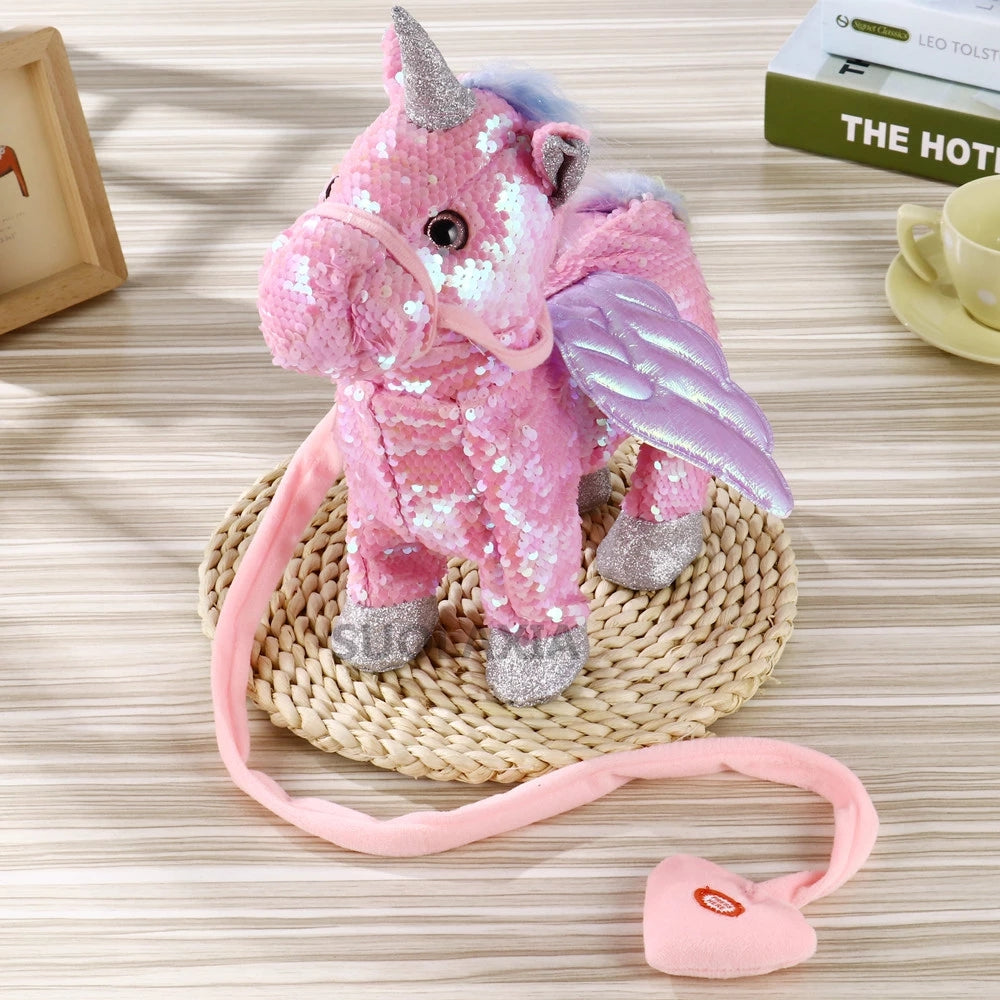 Basta apertar o botão em forma de coração que fica na ponta da trela, para que o unicórnio comece a funcionar.