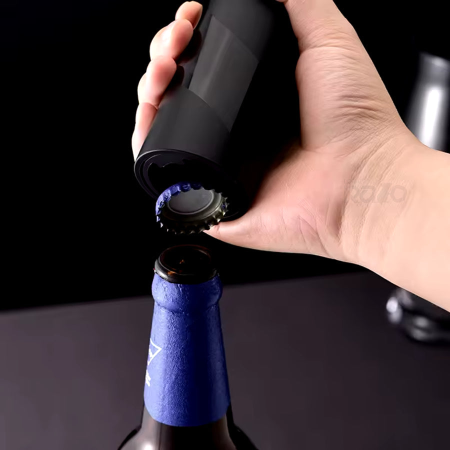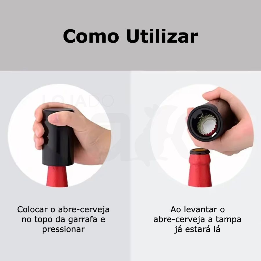 Nunca foi tão fácil remover a tampa da cerveja, como com o abre-cervejas automático. Basta colocá-lo por cima da tampa e pressionar para que esta seja removida.