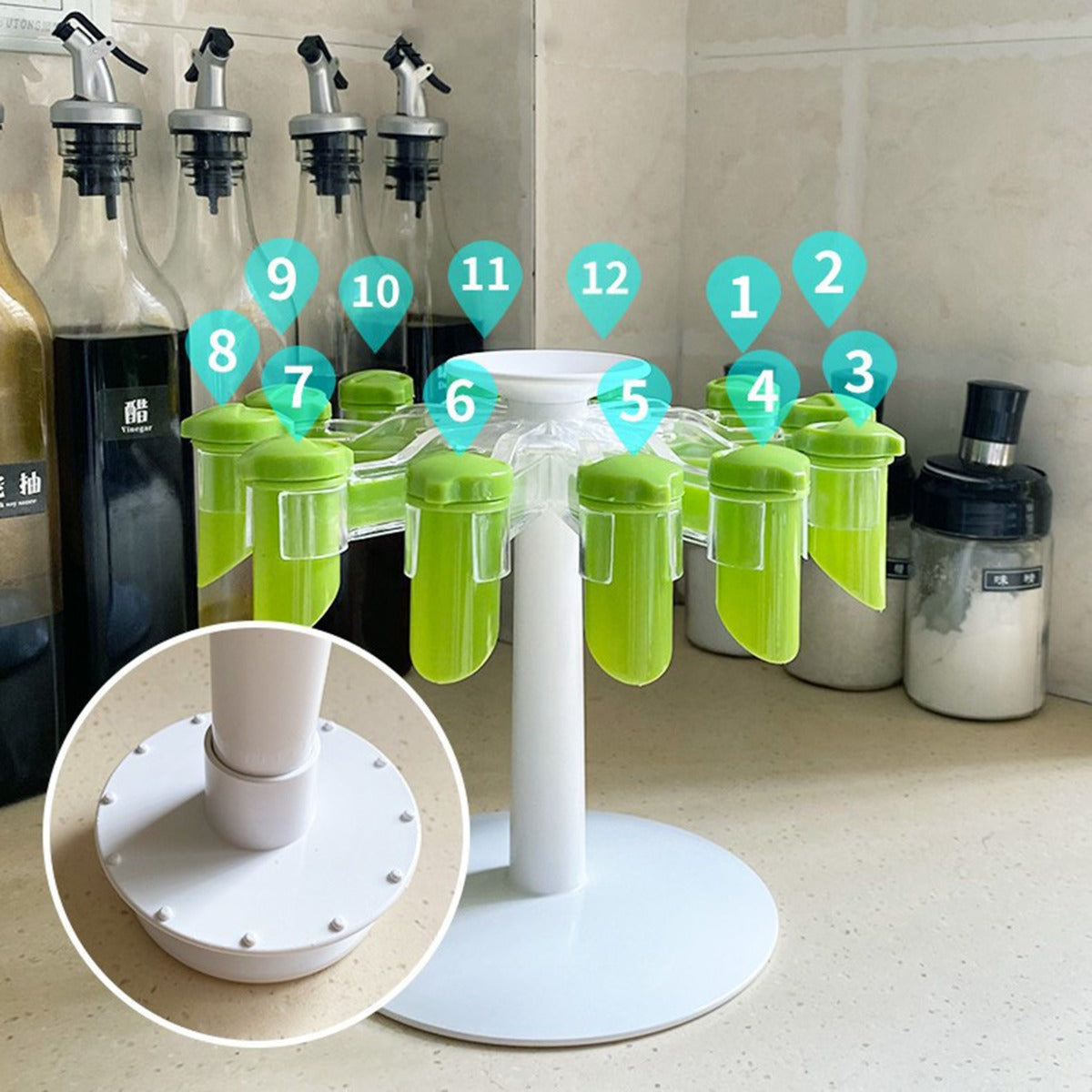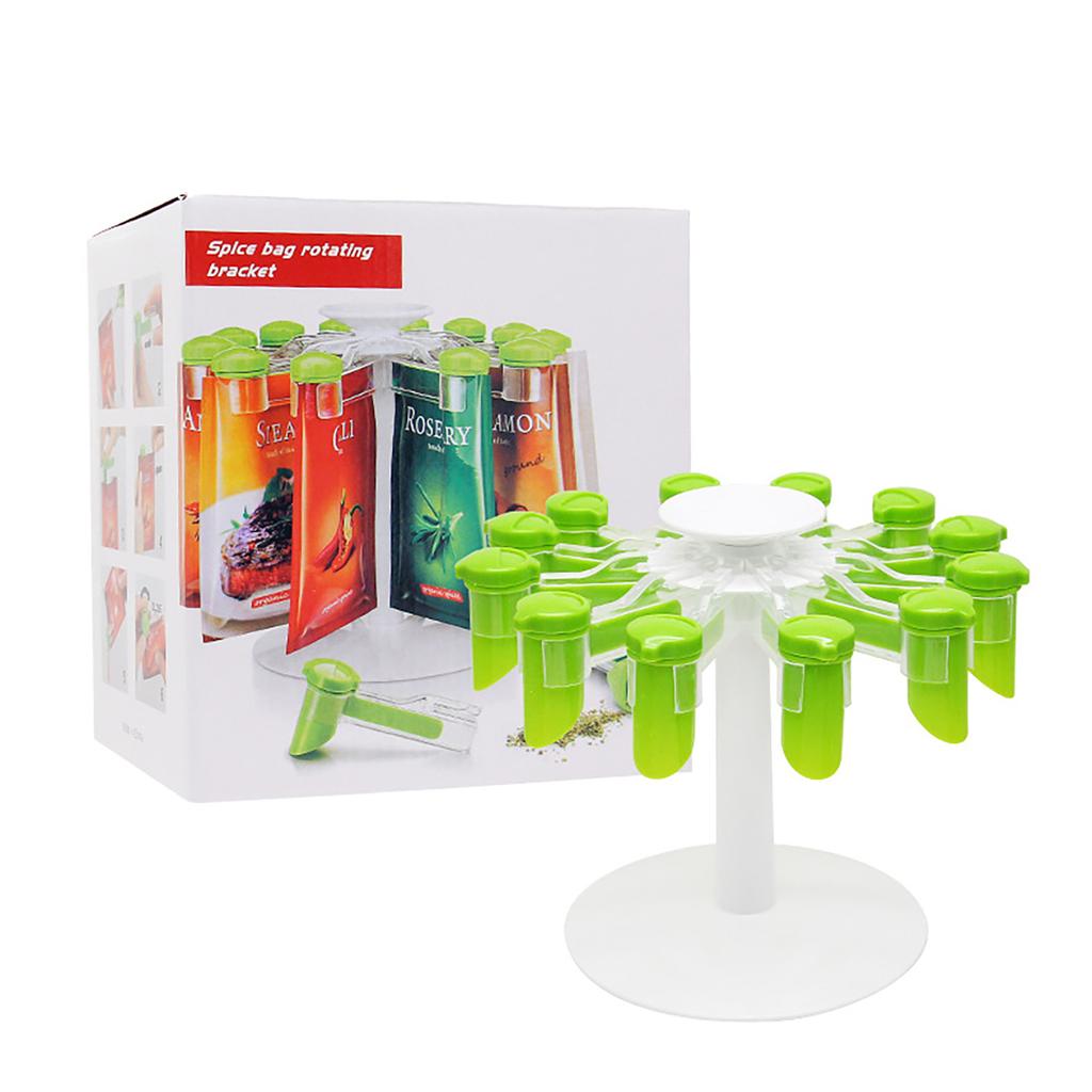 O Dispensador Rotativo De Especiarias é de montagem/ desmontagem fácil de modo a permitir uma utilização fácil e uma limpeza conveniente. Com um suporte rotativo em tons de branco e verde este dispensador tem capacidade para colocar até 12 saquetas de especiarias. Consegue ainda regular a quantidade que pretende colocar do tempero nas suas refeições.