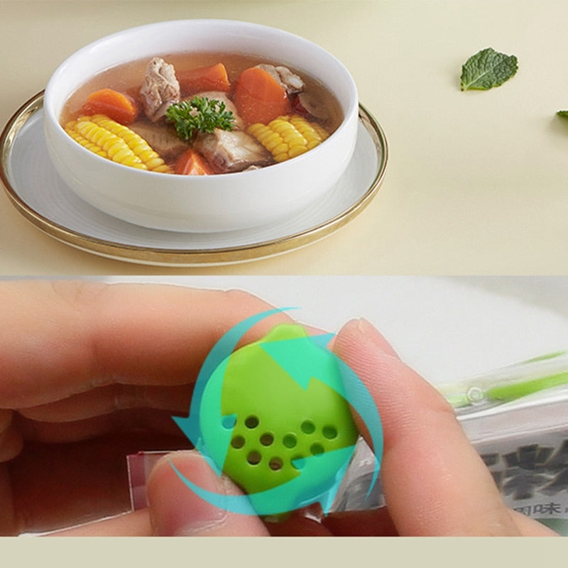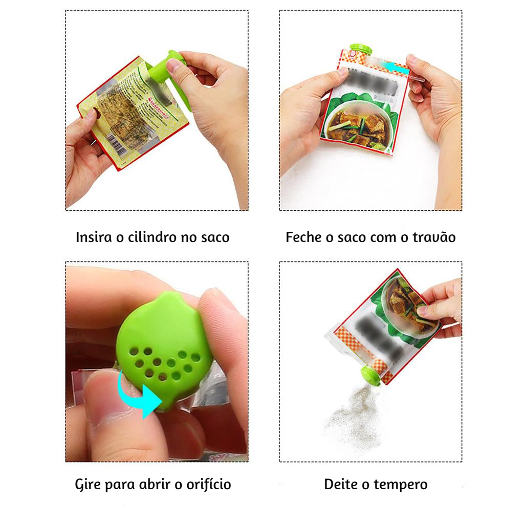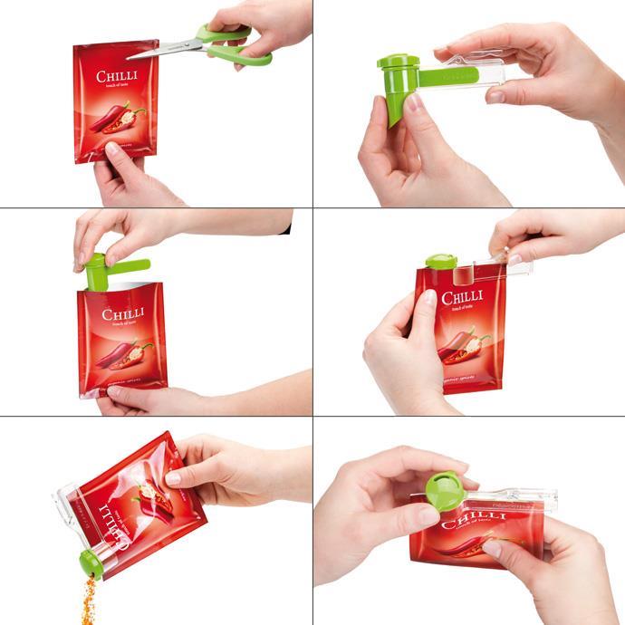 Corte a saqueta de especiarias e coloque no dispensador. Feche depois de usar para que as especiarias não ganhem humidade e permaneçam frescas.