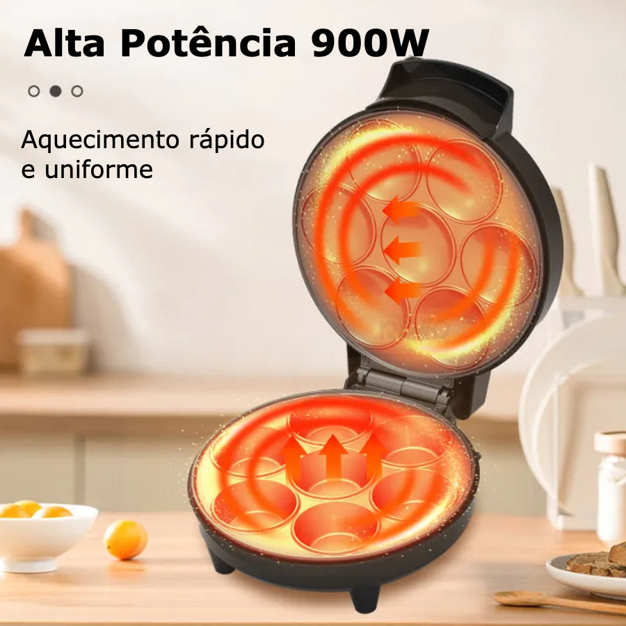 Pode fazer até 7 em simultâneo, com uma superfície antiaderente, e um aquecimento de dupla face, permite uma preparação uniforme e mais rápida.