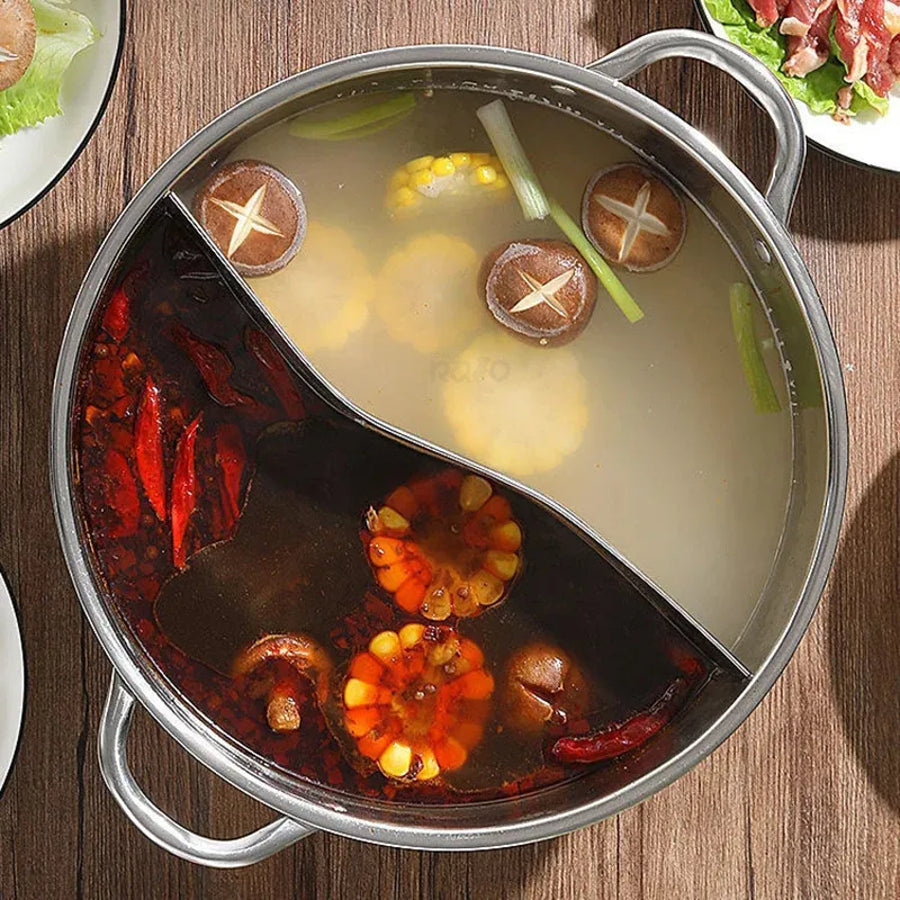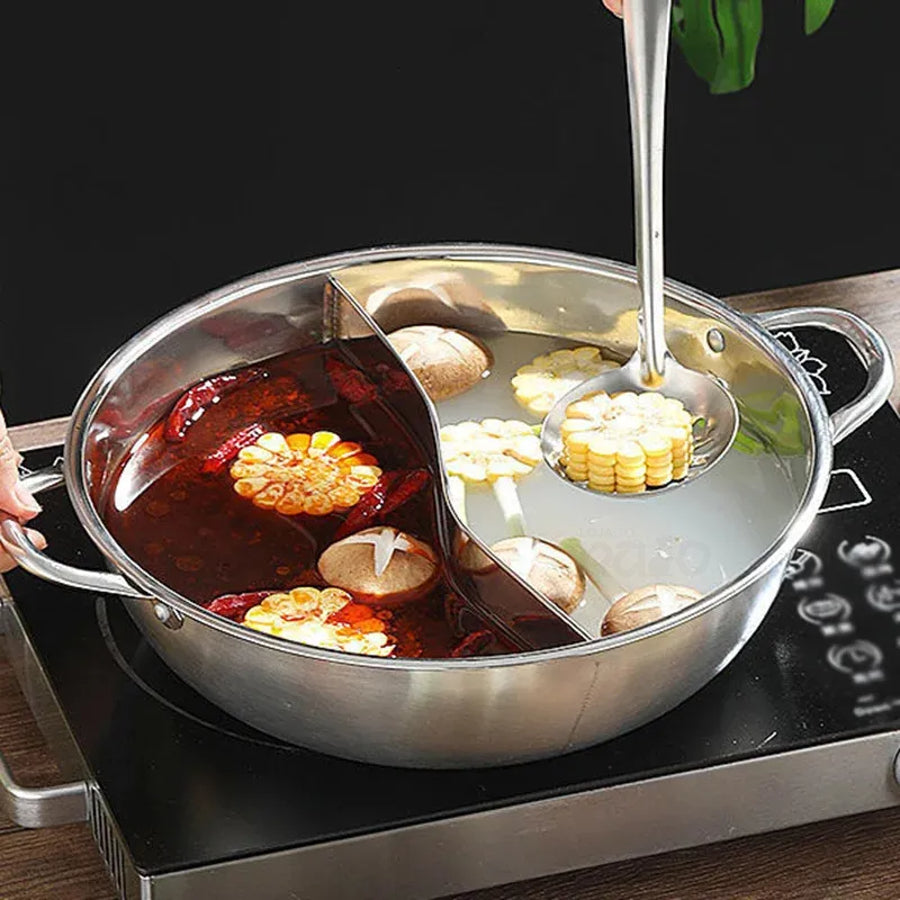 Contém uma divisória interna com a forma de s, podendo preparar dois pratos diferentes de uma só vez.
