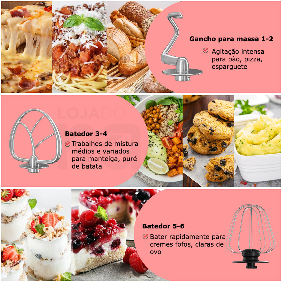 ✅ Contém três batedores diferentes, para amassar, misturar e bater;