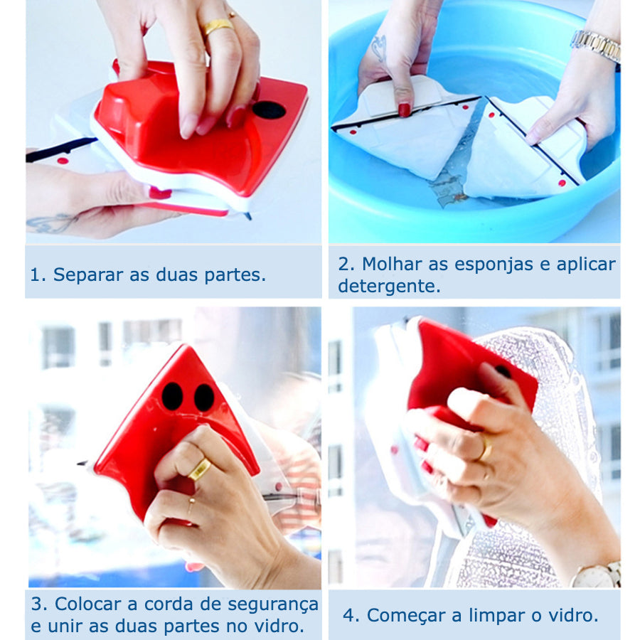 Basta separar as duas partes, molhar as esponjas com água e detergente, de seguida colocar a corda de segurança no pulso, colocar uma parte no exterior e outra no interior, ajustar a força magnética e estará pronto para limpar as janelas.