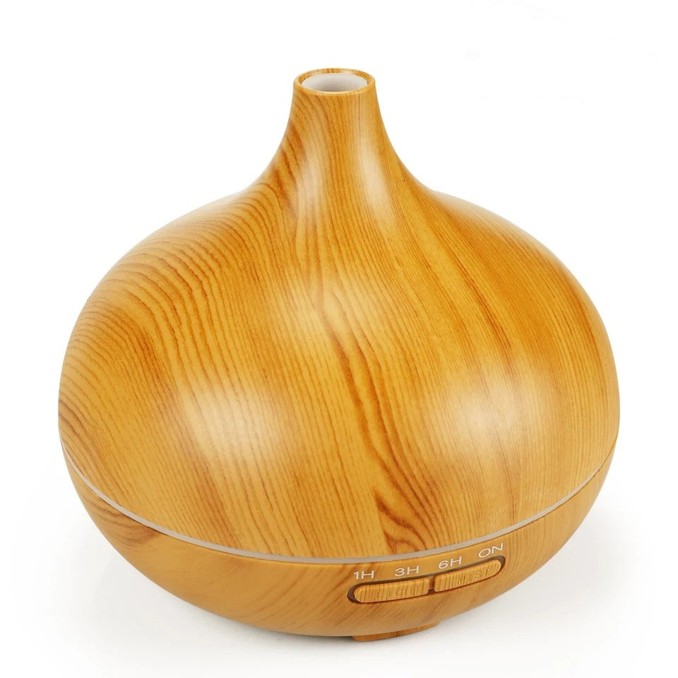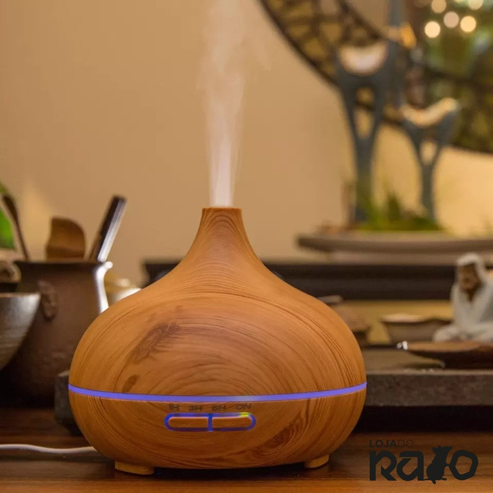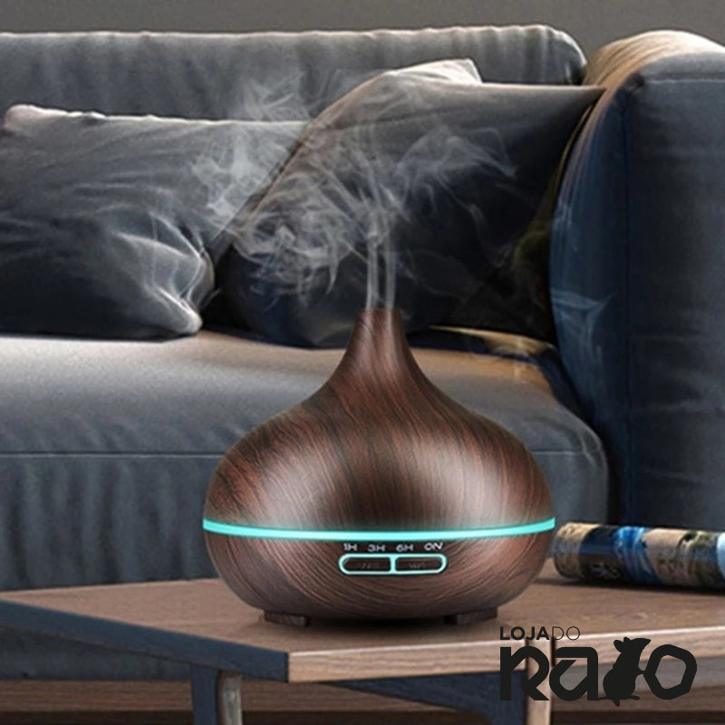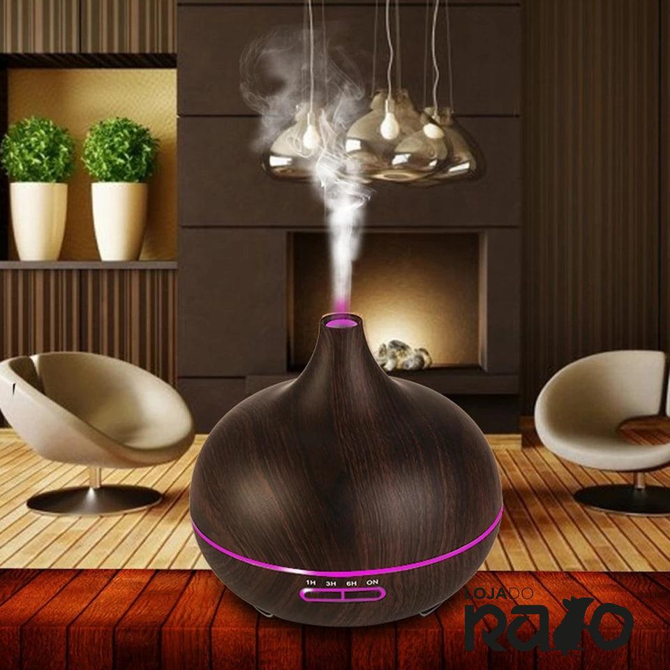 Este umidificador e aromatizador tem capacidade para 500 ml, com um design moderno e efeito de madeira , destaca-se por contar com luzes em LED, que serve como luz ambiente para o quarto ou a sala. É ligado na tomada.