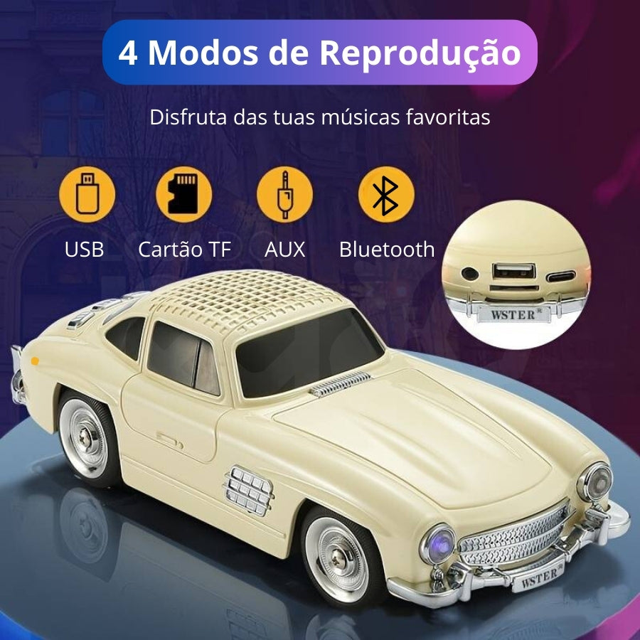 Com um design de carro vintage, com esta coluna pode ouvir música através de Bluetooth, USB, cartão TF ou cabo AUX. E ainda a possibilidade de ouvir as suas estações de rádio favoritas.