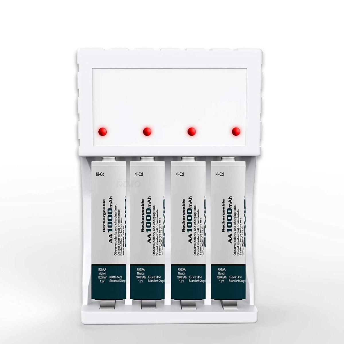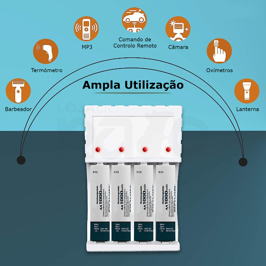 Pode carregar 1 a 4 pilhas em simultâneo de tamanho AA/AAA. Contém uma luz indicadora de carregamento das pilhas.