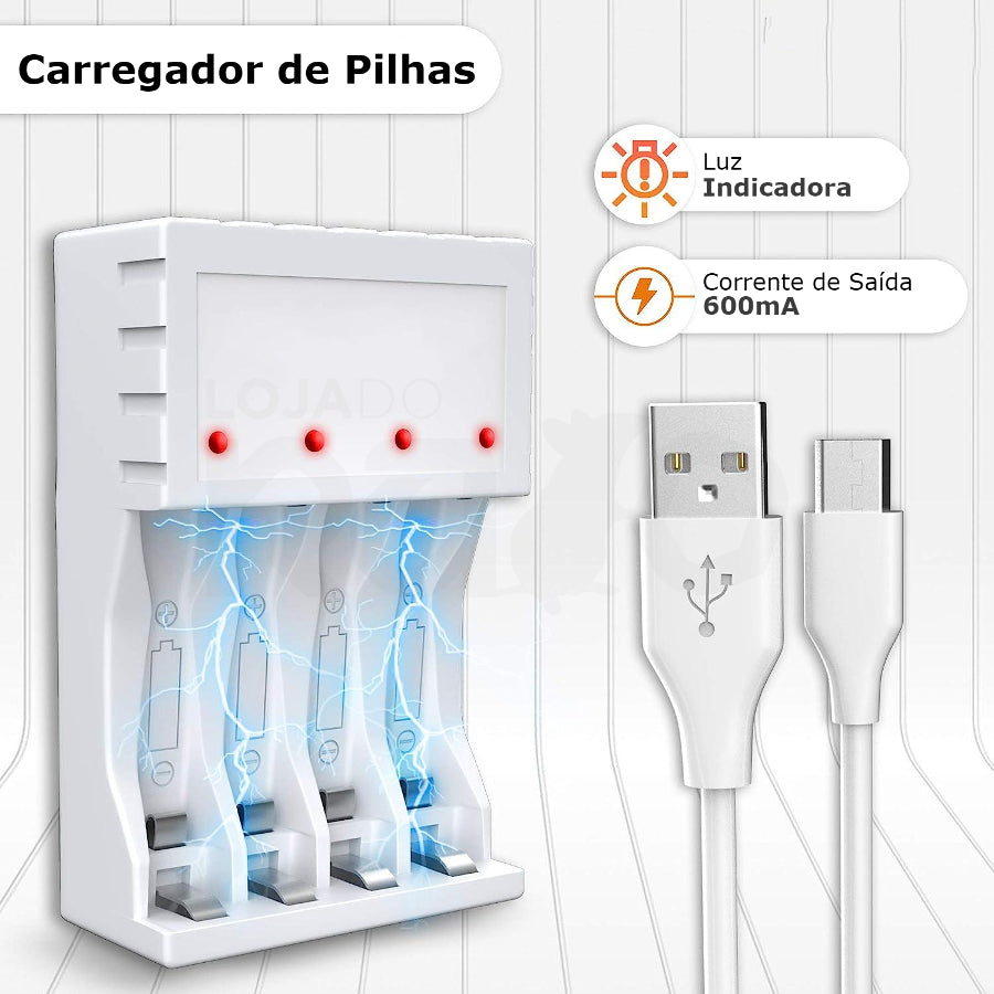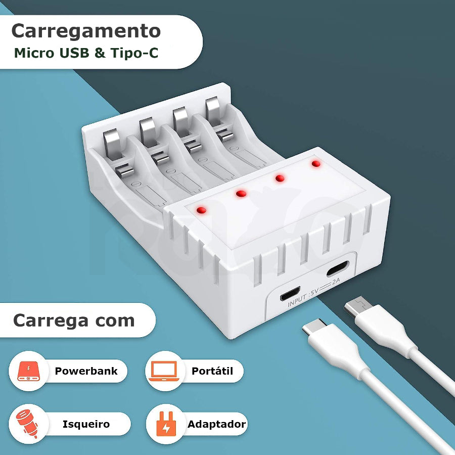 A grande vantagem deste carregador é poder ligá-lo a uma powerbank, isqueiro, portátil ou até mesmo a um adaptador para este fazer o carregamento das pilhas.