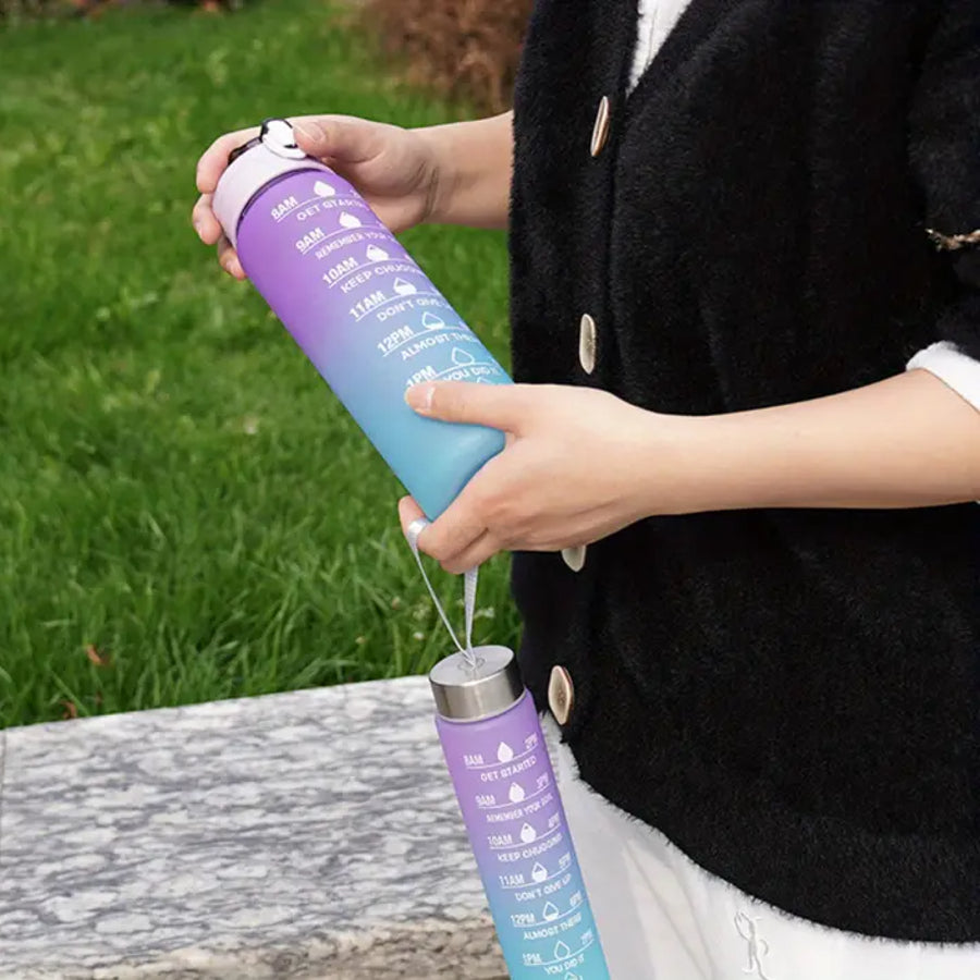 Cada garrafa vem com marcações horárias e frases inspiradoras para te incentivar a beber mais água e cuidar da tua saúde de forma divertida e consistente.