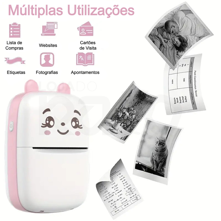 Com a mini impressora pode imprimir fotografias, apontamentos, etiquetas entre outras coisas, bastando conectar a impressora ao telemóvel e através da aplicação definir o que imprimir.