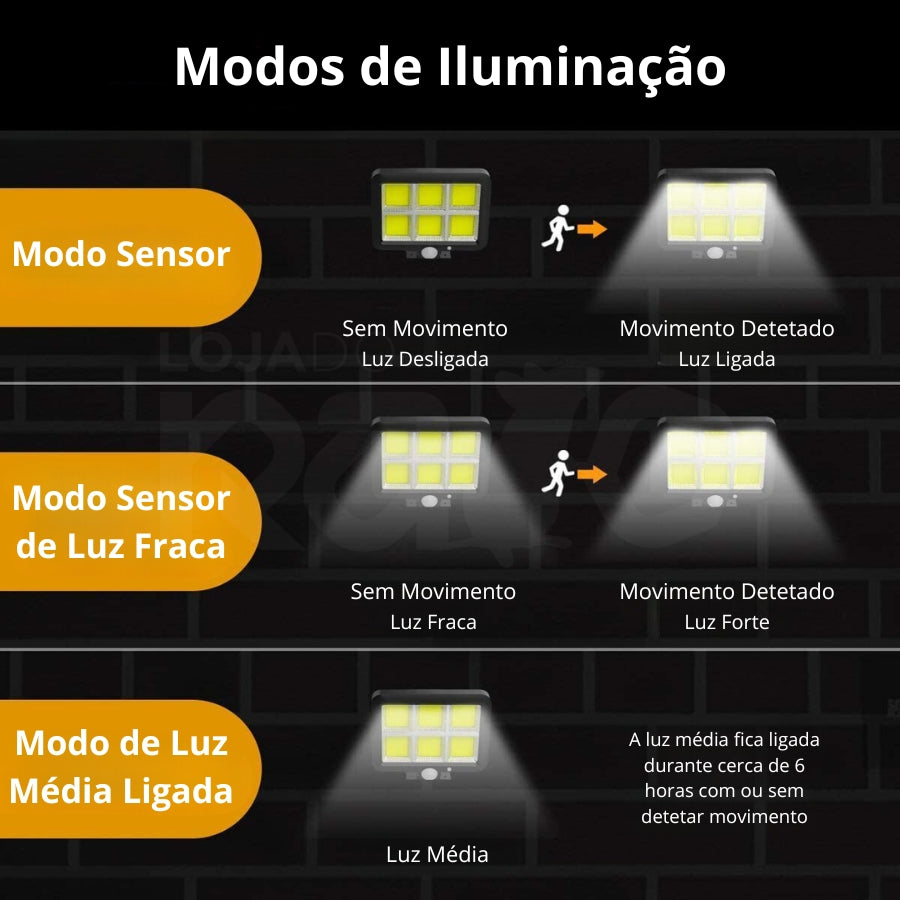 Contém quatro modos de iluminação, modo luz sempre ligada, modo luz média ligada, modo sensor de movimento ou então modo luz a piscar referente ao modo SOS.