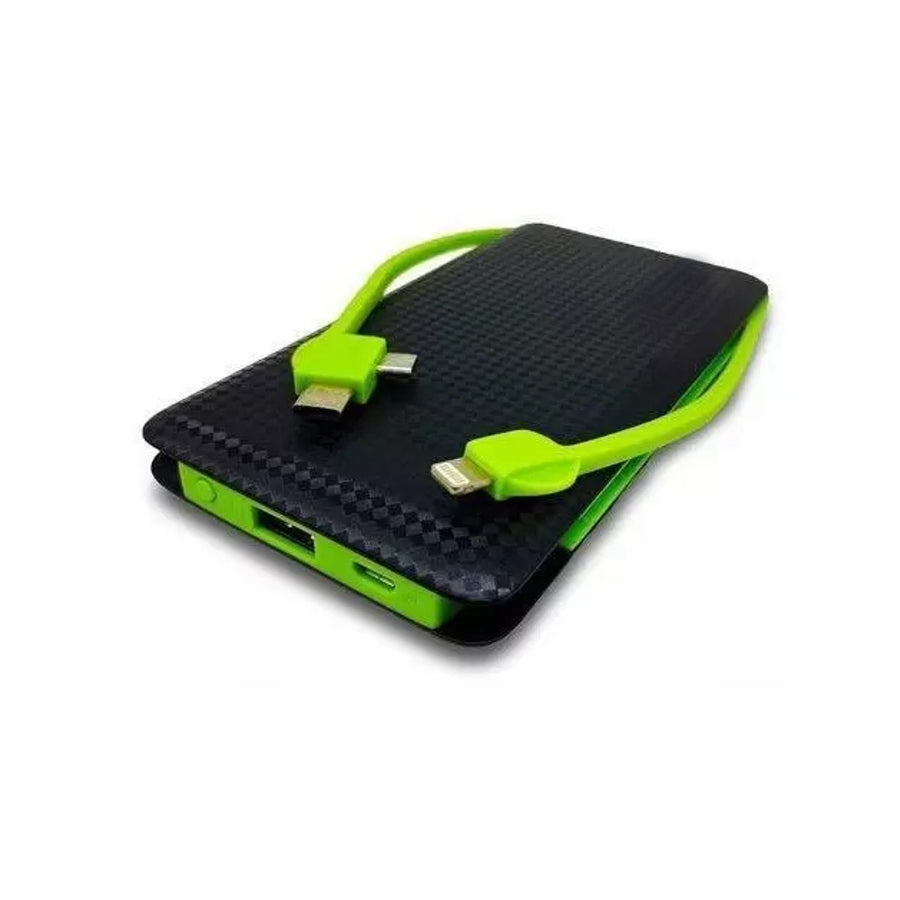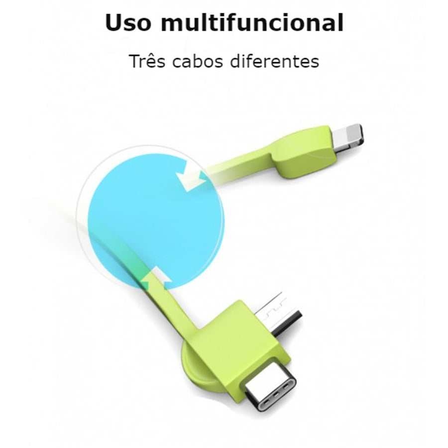 Contém uma entrada de carregamento USB, uma entrada micro USB e contém uma saída com cabo Type-C, micro USB e lightning.