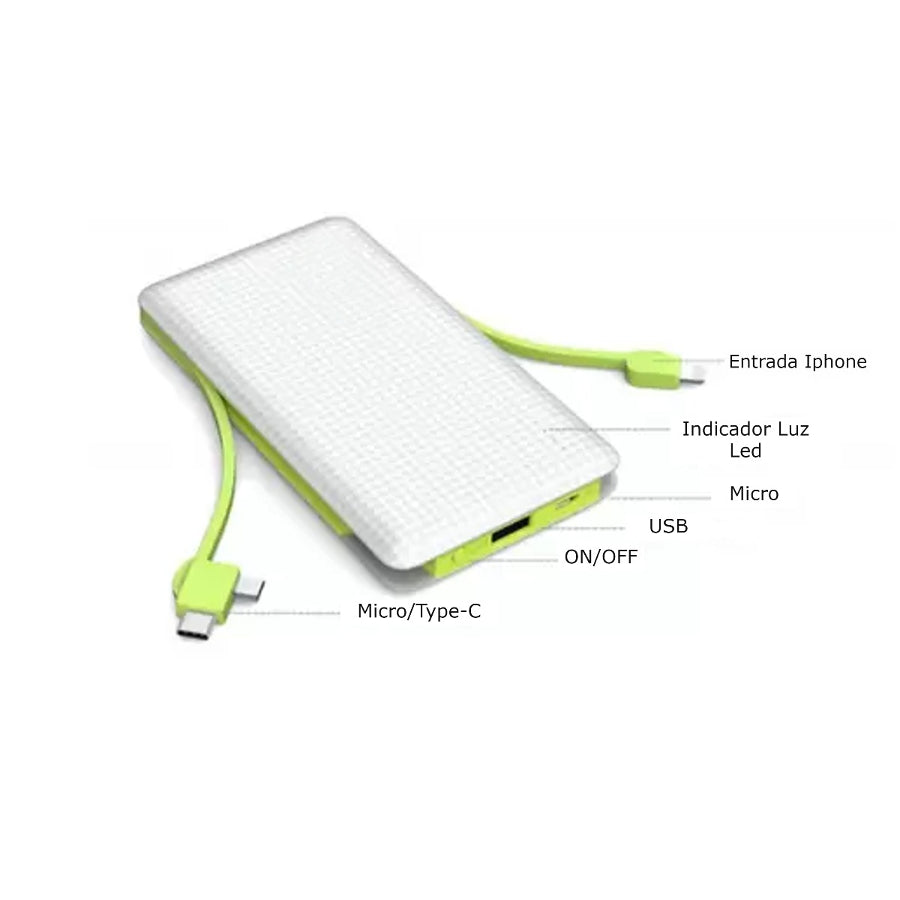 - Entradas: 5V 2A (TypeC / cabo de Iphone / MicroUSB)