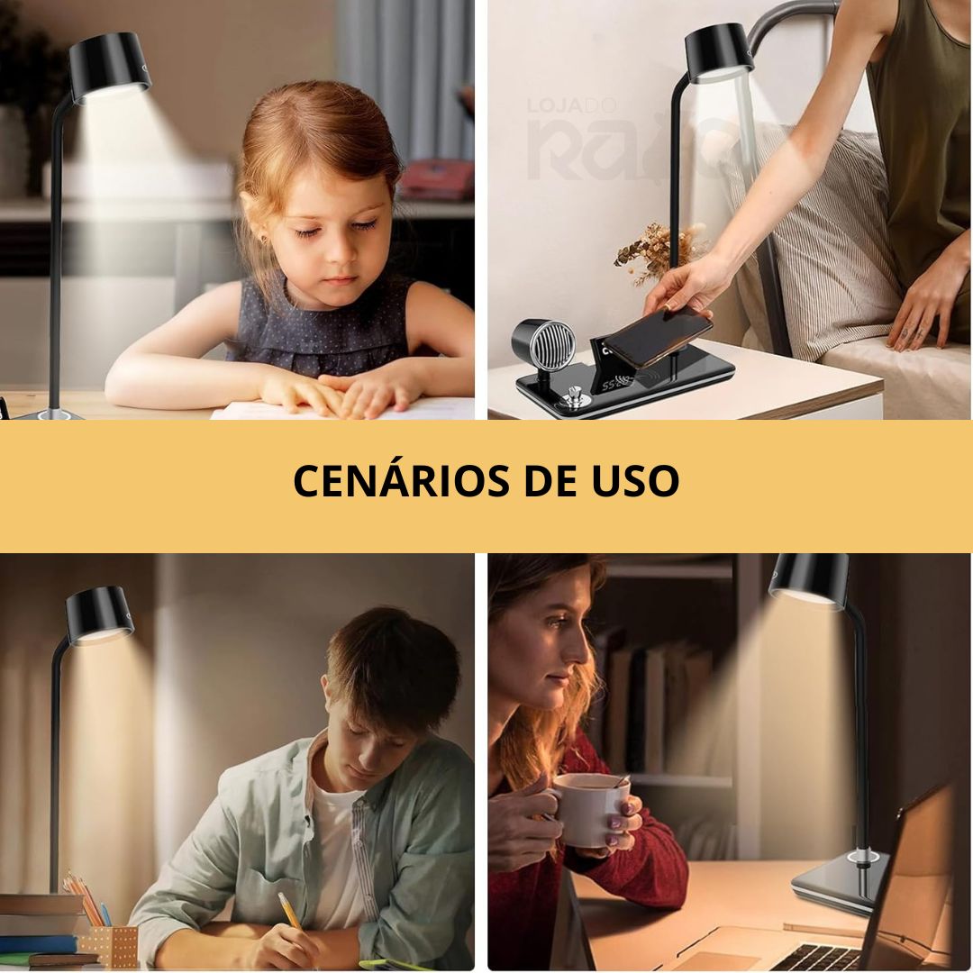 Ideal para quarto, escritório, estudo ou mesa de cabeceira, combina luz de qualidade, som envolvente e carregamento prático, tudo num design compacto e moderno.