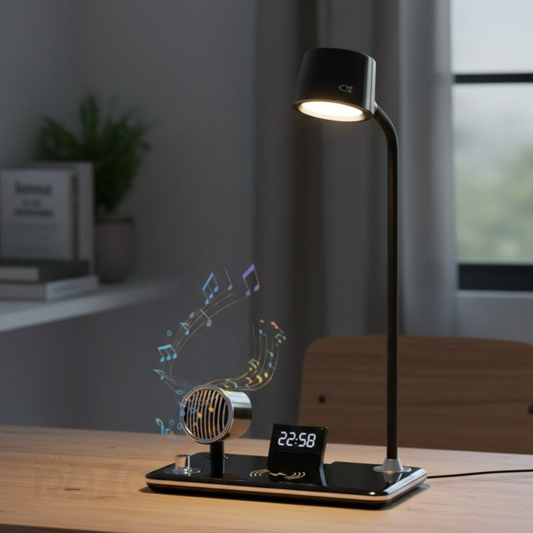 Com iluminação LED regulável, carregamento sem fios, altifalante Bluetooth e relógio digital, este candeeiro transforma qualquer secretária ou mesa de cabeceira num espaço mais funcional, elegante e inteligente.