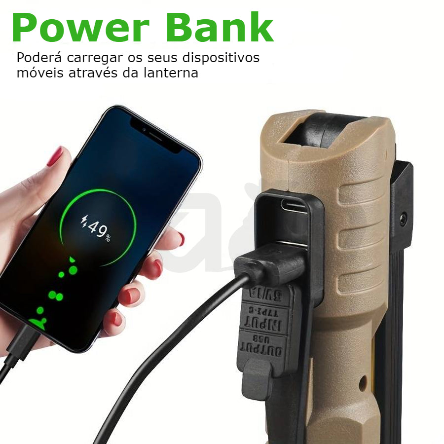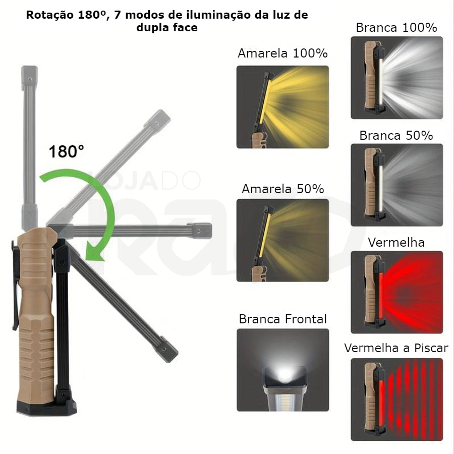 O design giratório de 180 graus, permite que a lanterna forneça iluminação em vários ângulos. Contém um íman e um gancho giratório, para que possa colocar a lanterna de várias formas de maneira que fique com as mãos livres para realizar qualquer atividade.