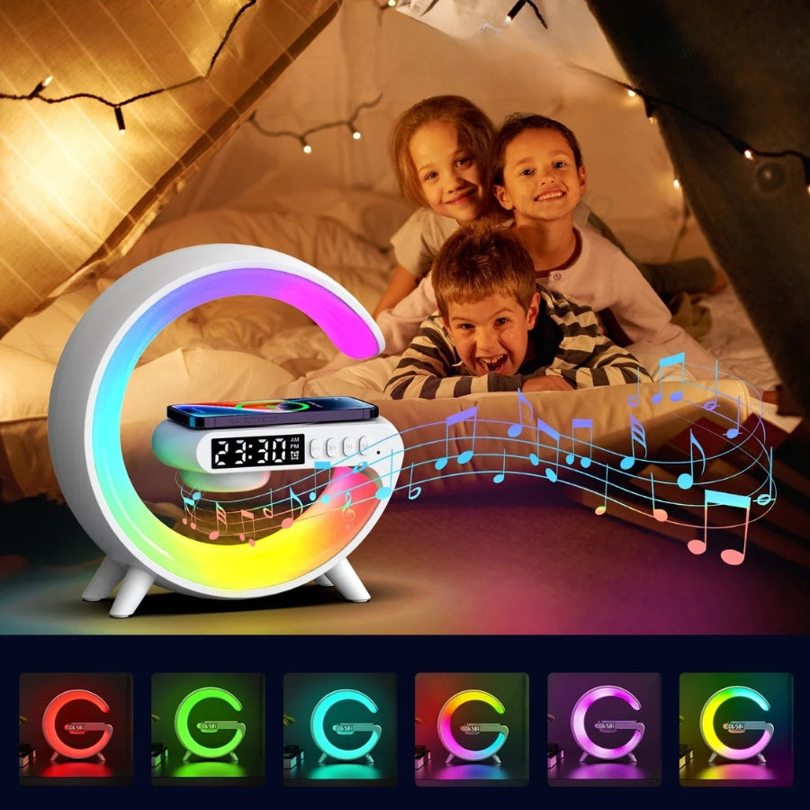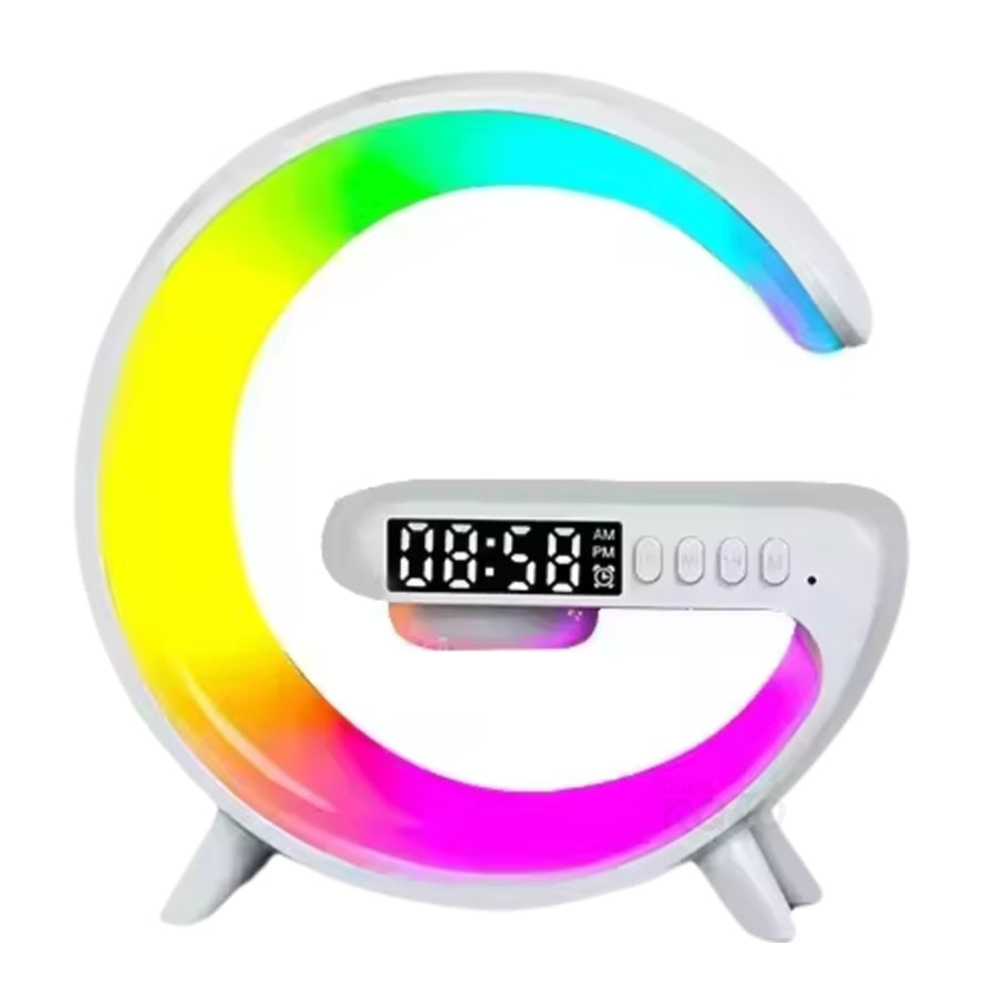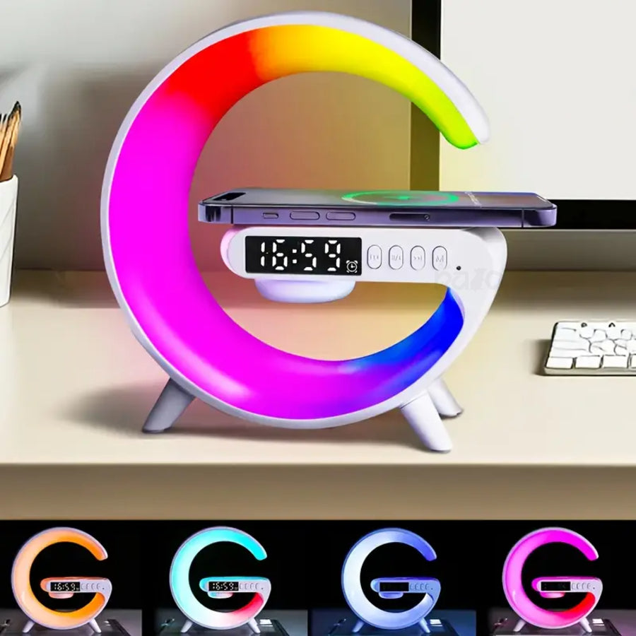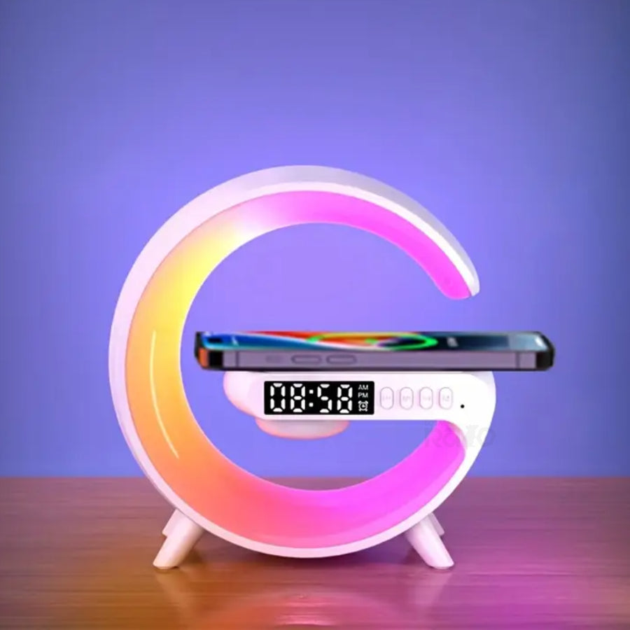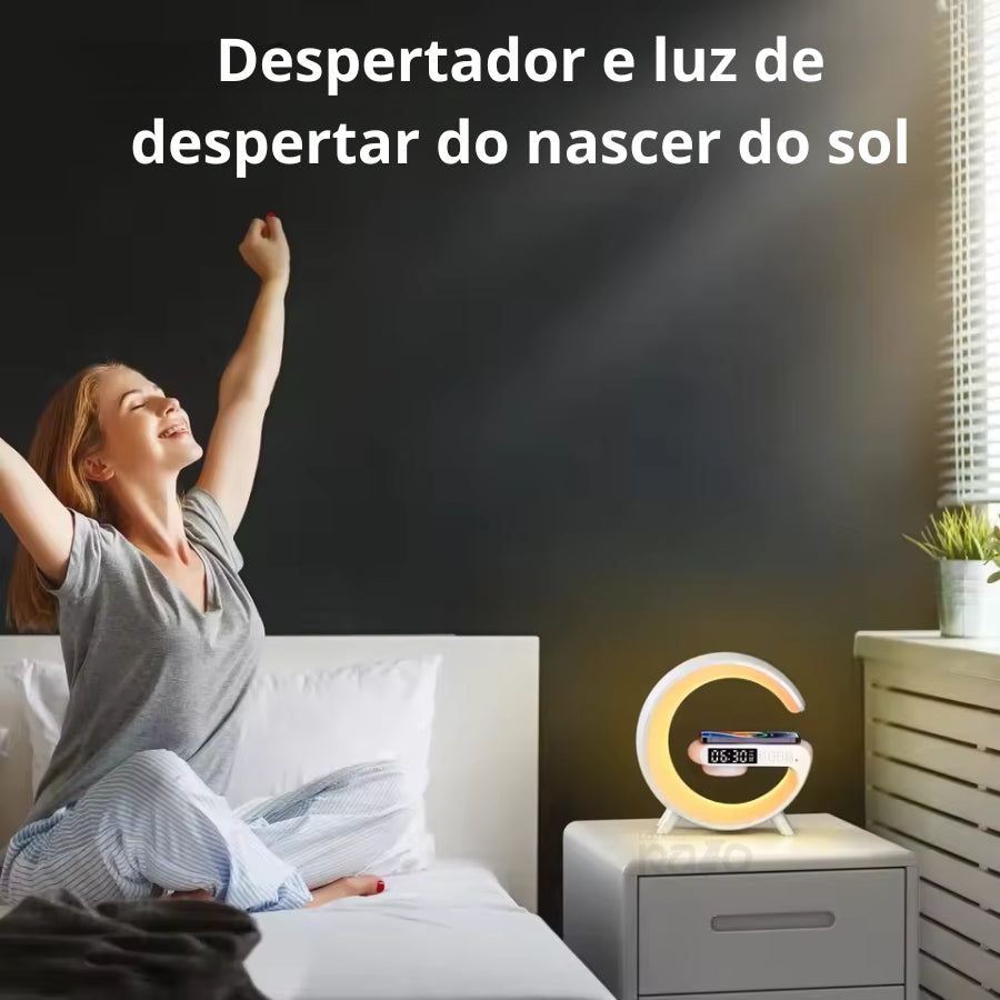 Este candeeiro multifuncional combina iluminação LED, carregamento wireless, relógio digital e alarme num design moderno e compacto.