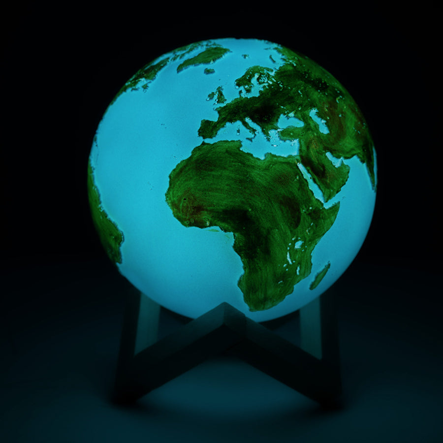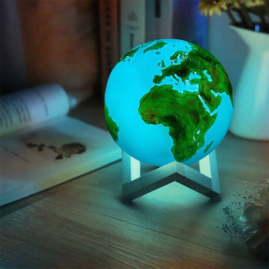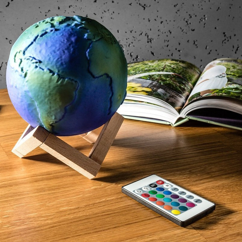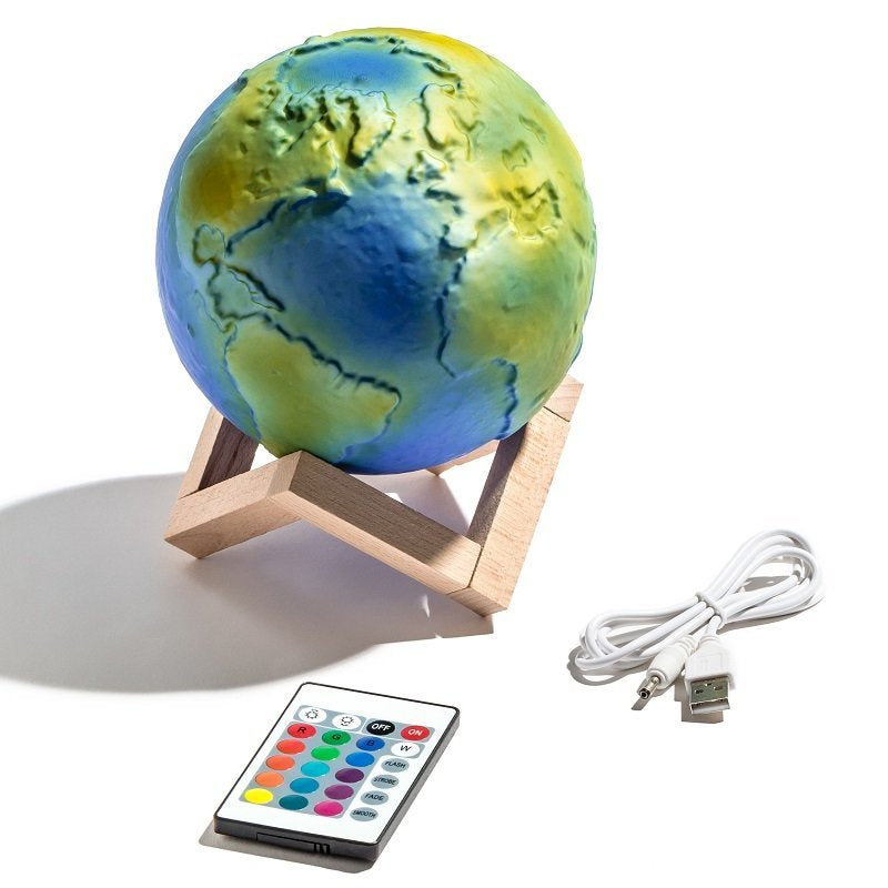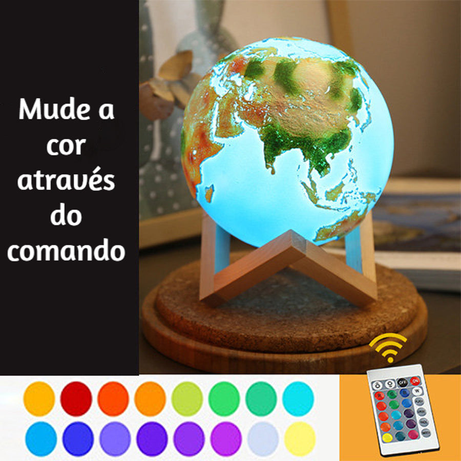 Dê um toque de originalidade à iluminação e decoração da sua casa com o novo Candeeiro 3D do Planeta Terra. Com um suporte de madeira, este candeeiro apresenta um design realista representativo da forma e superfície terrestre do nosso planeta. Equipado com diferentes tipos de luz e um comando.