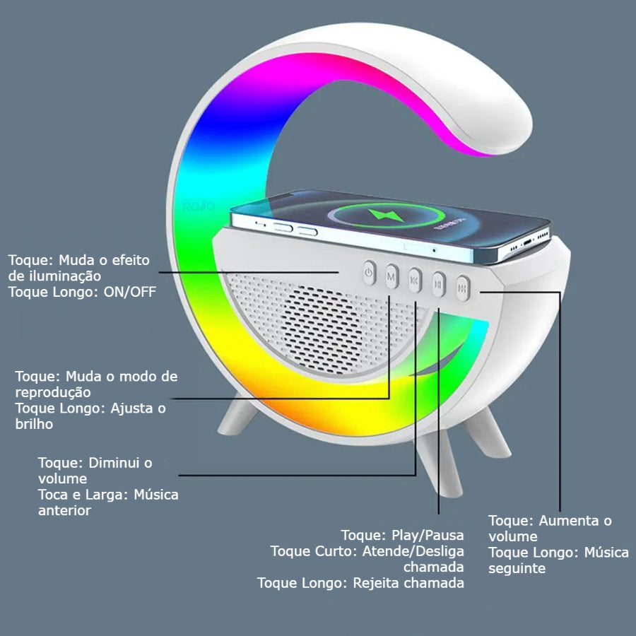 - Funções Principais: Bluetooth, Cartão SD, AUX, USB, Carregamento Wireless, Luzes LED
