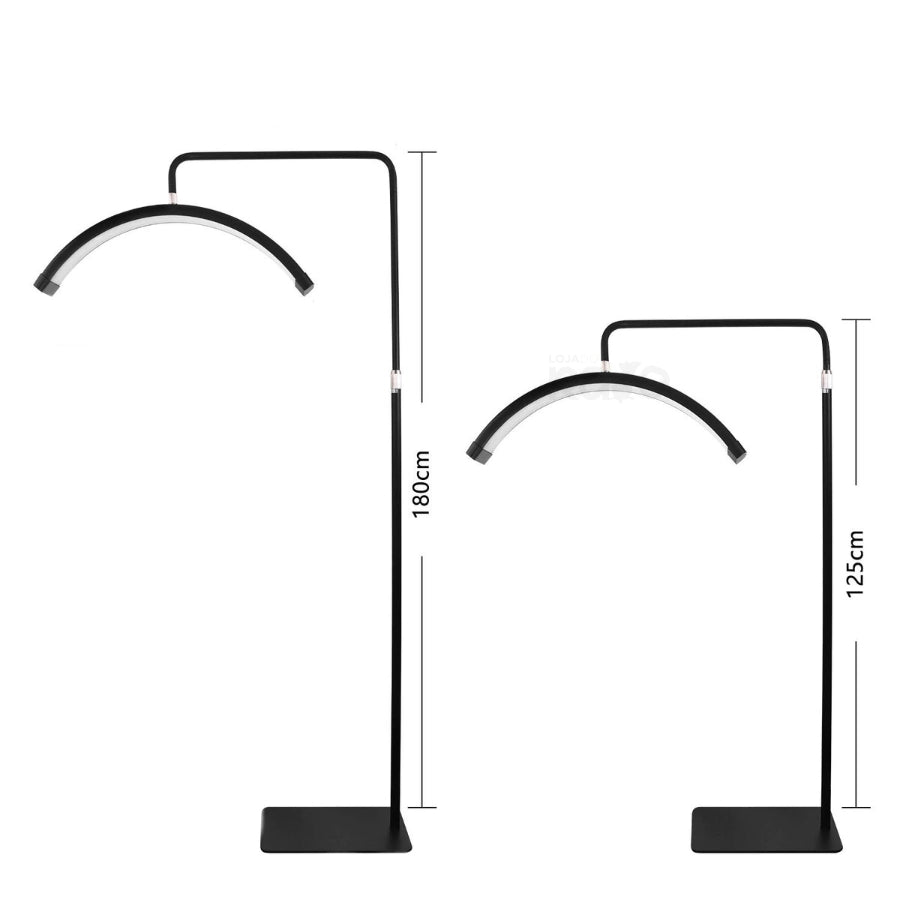 O tripé ajustável, com altura ajustável entre 125cm e 180cm, proporciona flexibilidade na disposição da iluminação, adaptando-se às suas necessidades específicas.