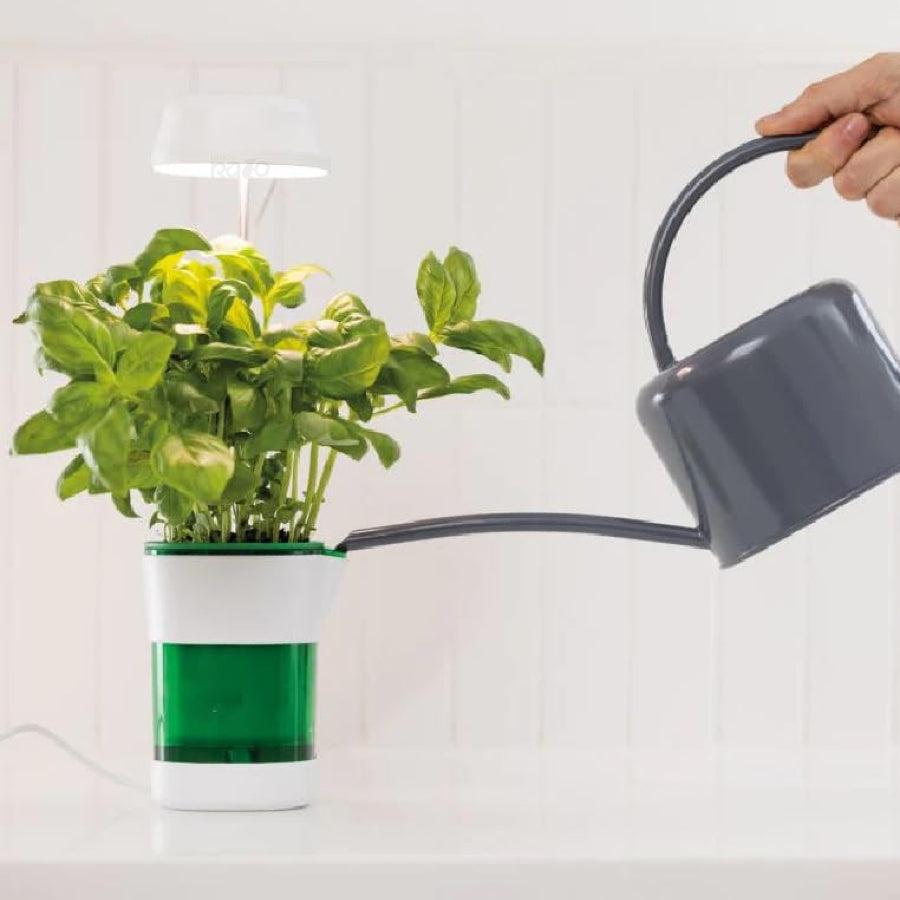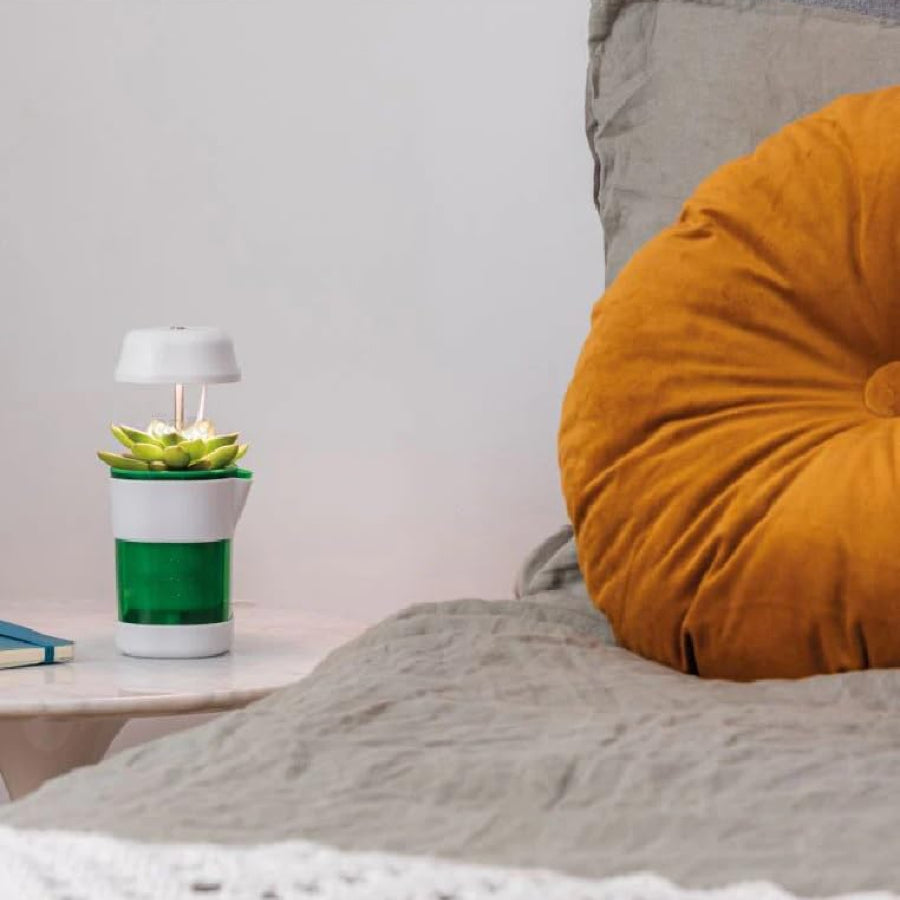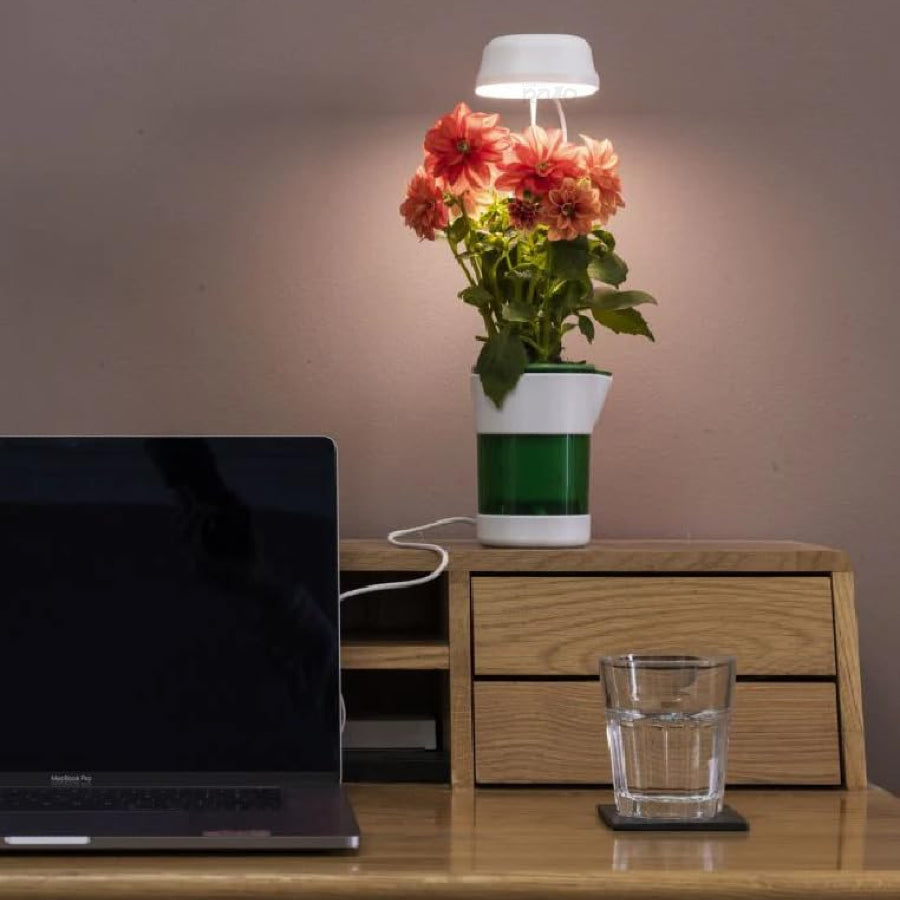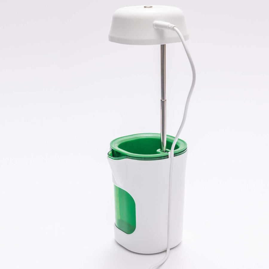 O vaso é para cultivo interno e contém uma lâmpada com 10 leds que replica a luz solar natural para o crescimento das plantas em ambientes internos.