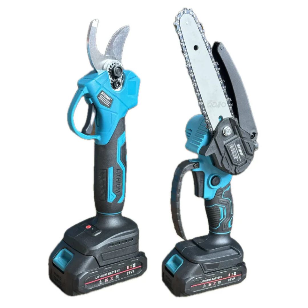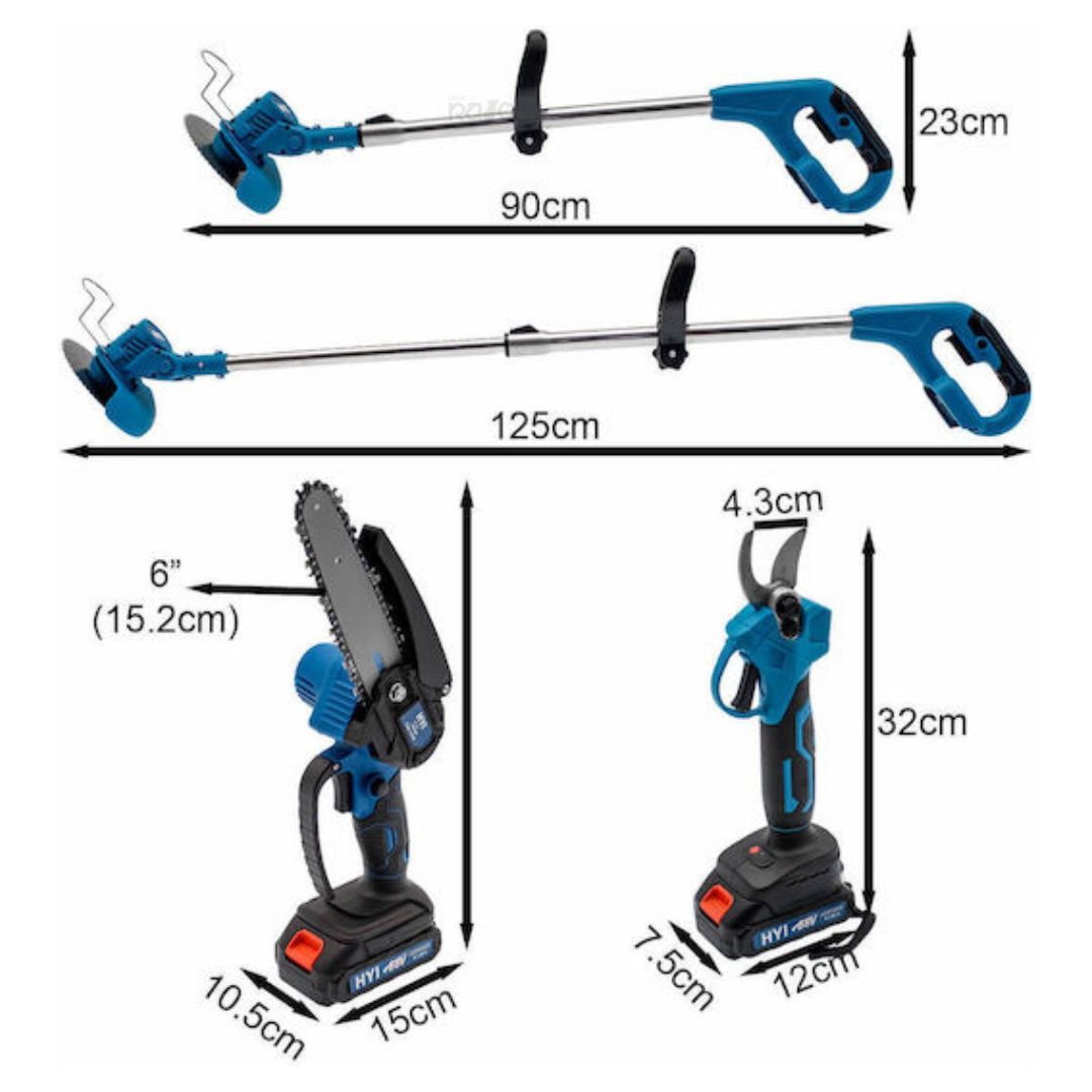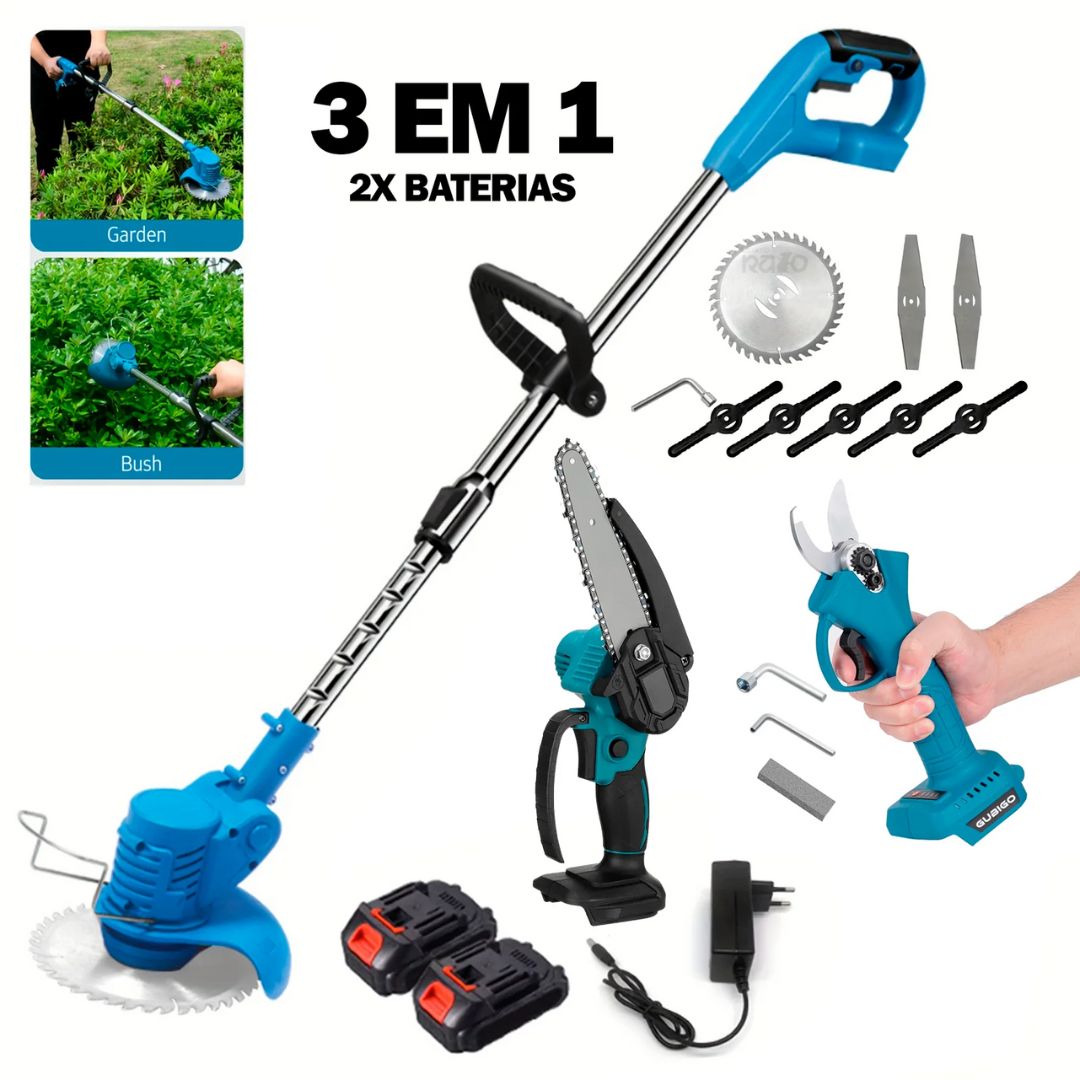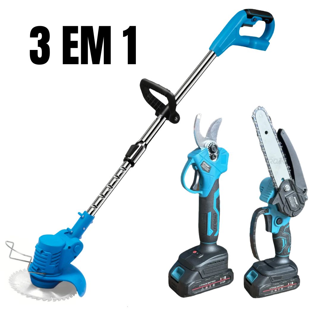 Este kit completo reúne uma roçadora extensível, uma serra de poda de 6 polegadas com lubrificação automática e uma tesoura de poda, tudo com bateria recarregável de carregamento rápido. Ideal para quem procura performance e comodidade numa só solução.