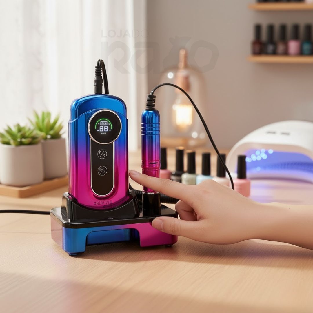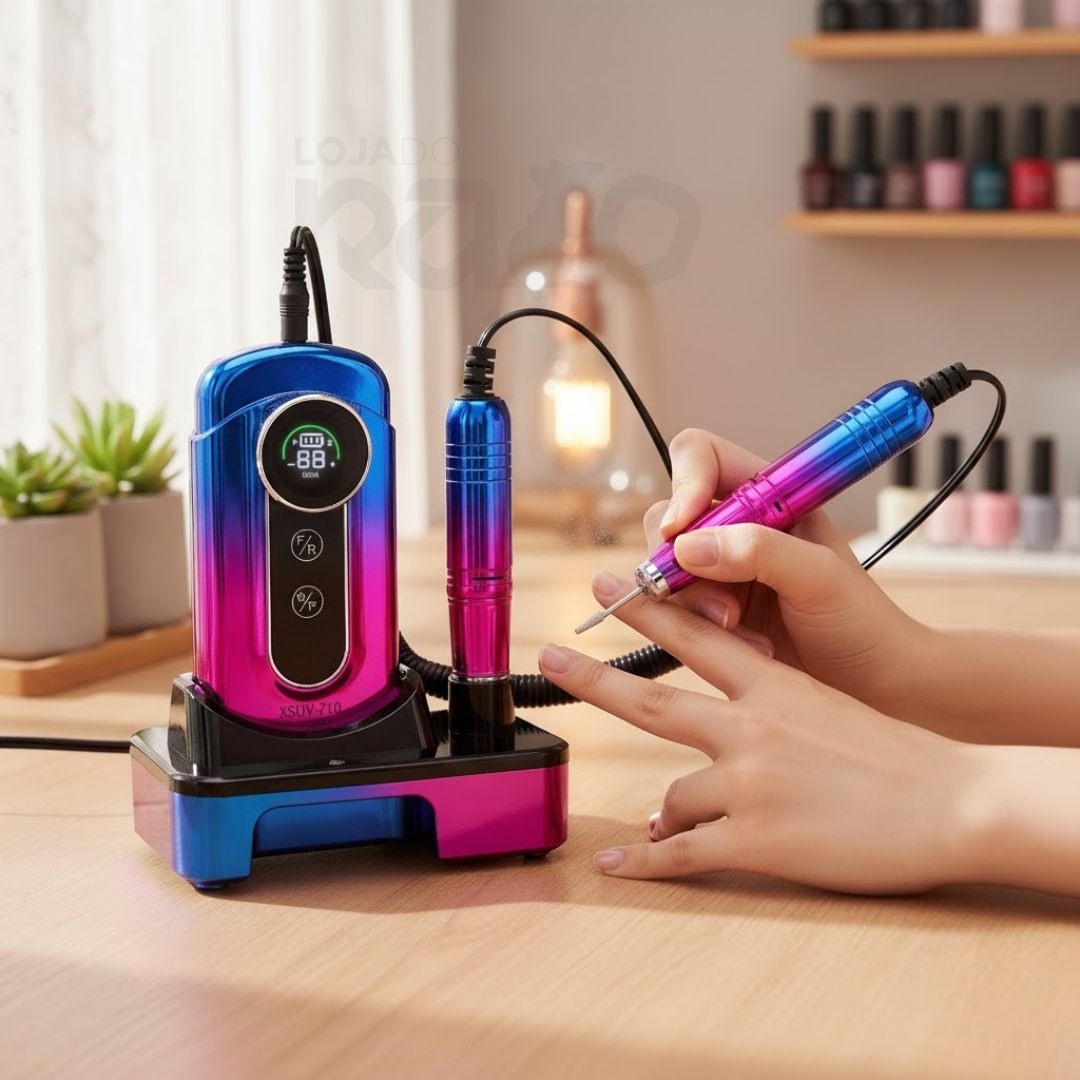 Com um design degradé estilo macaron e motor potente de 36W, esta lima elétrica oferece velocidades ajustáveis até 45.000 RPM, ideal para polir, limar, modelar e remover gel ou acrílico de forma fácil, precisa e segura.