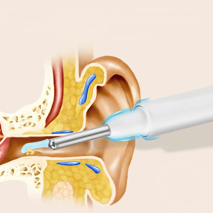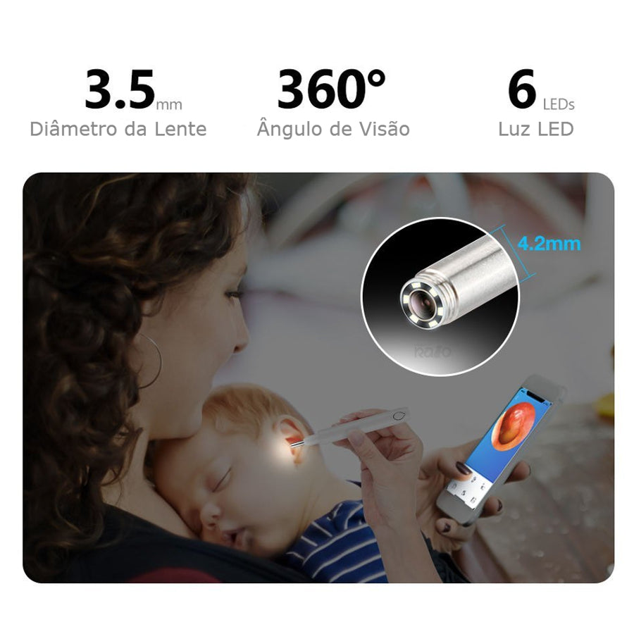 O otoscópio sem fios, possui uma lente angular de 360º, permitindo uma cobertura total para ajudar a remover a cera do ouvido com mais facilidade.