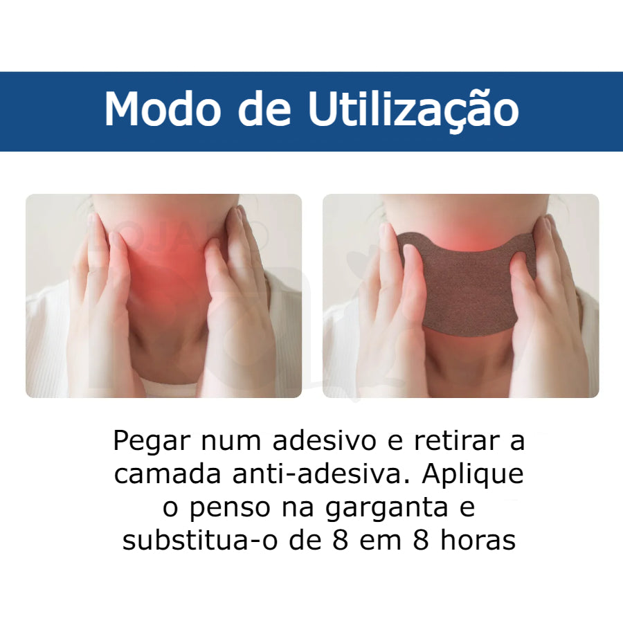 A sua utilização é fácil, basta retirar a película protetora do adesivo, aplicar na garganta e mudar de 8 em 8 horas.
