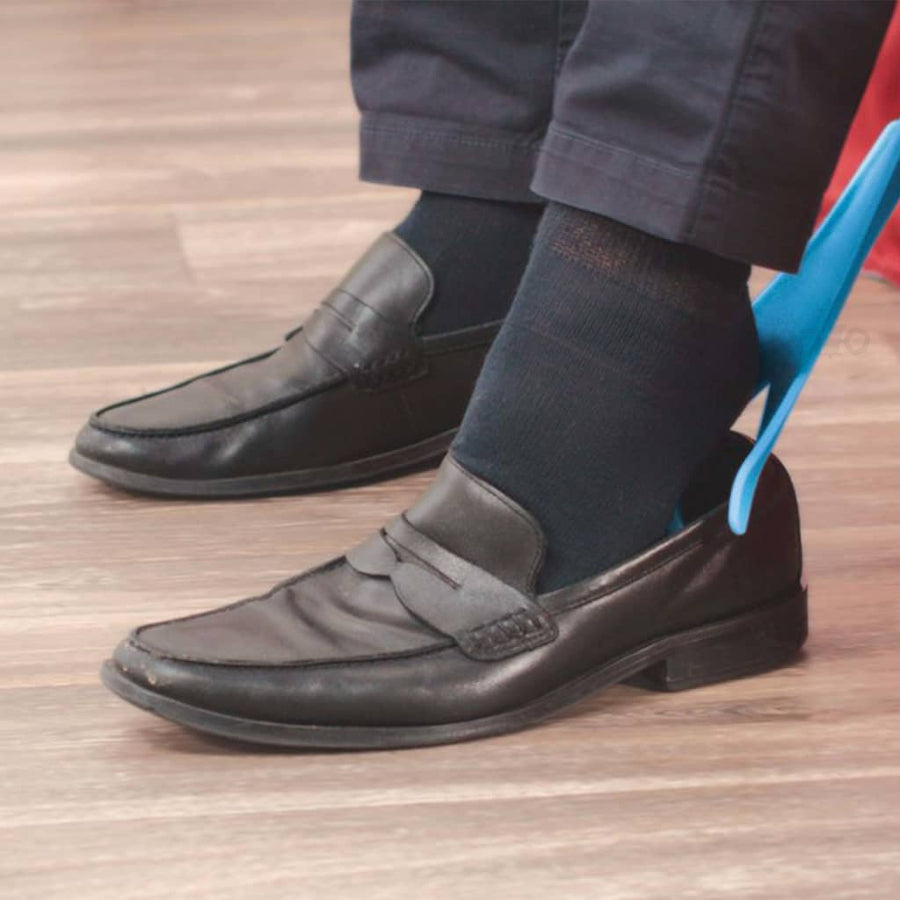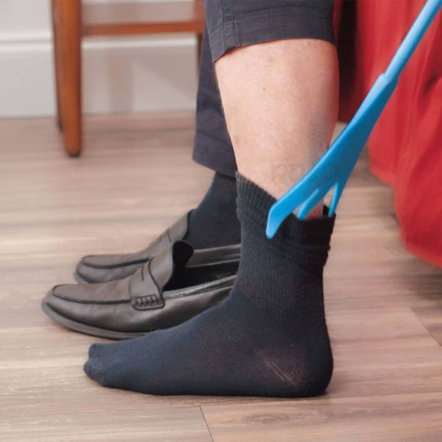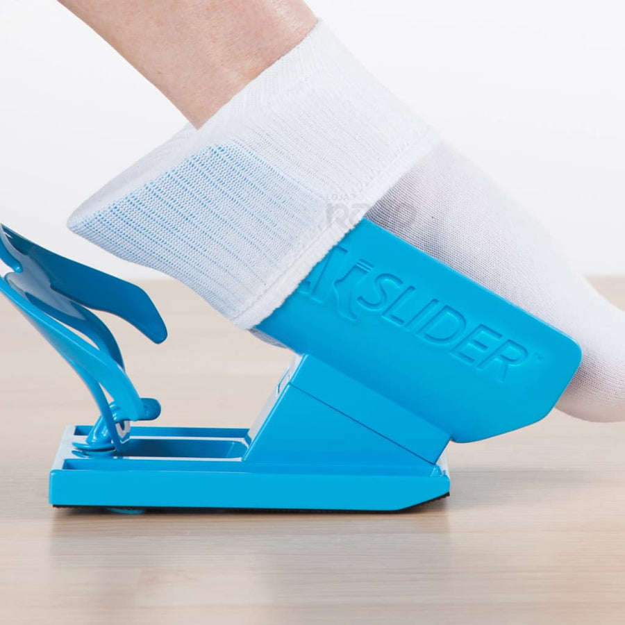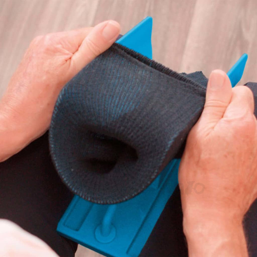 O sock slider é um suporte para meias e uma alça que o ajudará a calçar as meias sem se curvar, torcer ou virar.