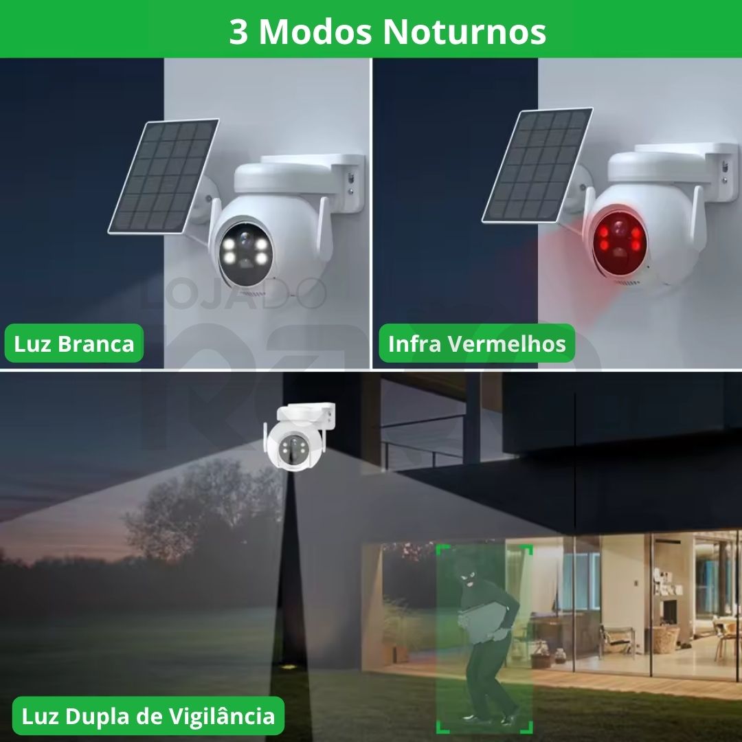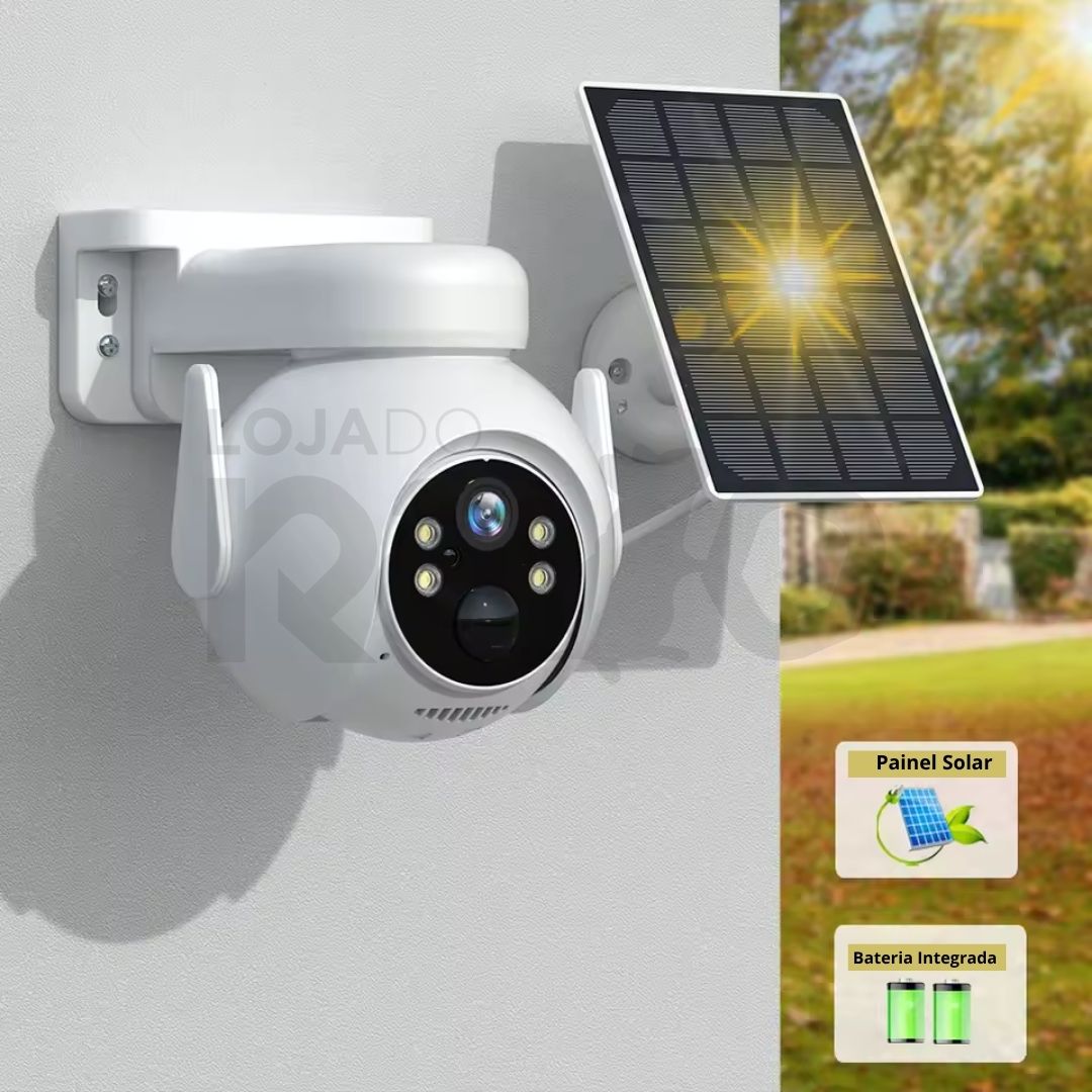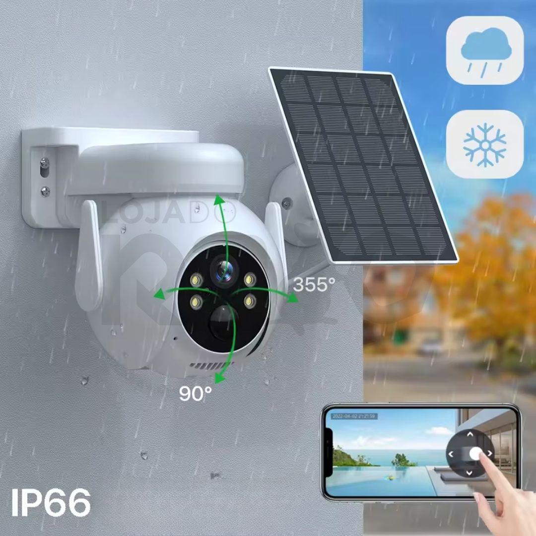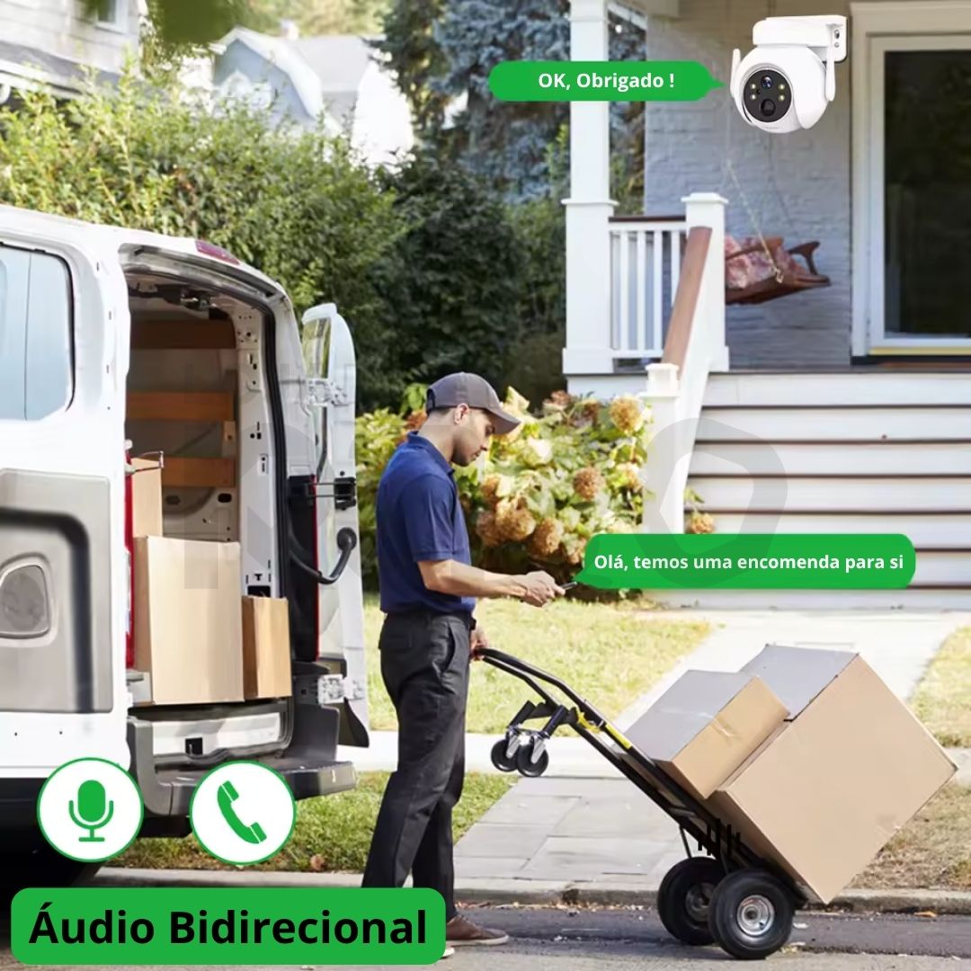 Esta câmara de vigilância solar WiFi, com bateria integrada de 7800 mAh e painel solar de 5 W, garante até 180 dias de autonomia com luz solar ou 90 dias sem sol. Com resolução 4MP HD, visão noturna a cores e detecção inteligente de movimento por sensor PIR, assegura vigilância exterior segura 24/7, com alertas no seu telemóvel.