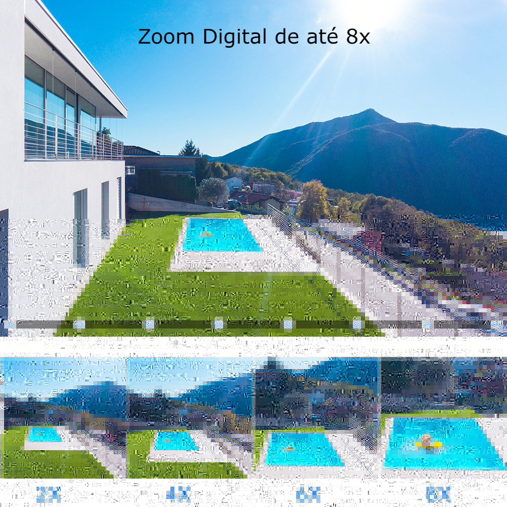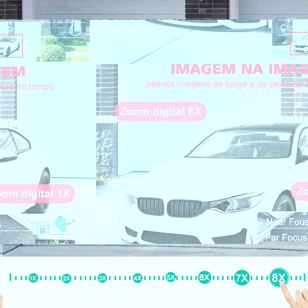 Pode mudar de 1x para 8x zoom digital instantaneamente, assistir a imagens distantes e próximas através da imagem na imagem.