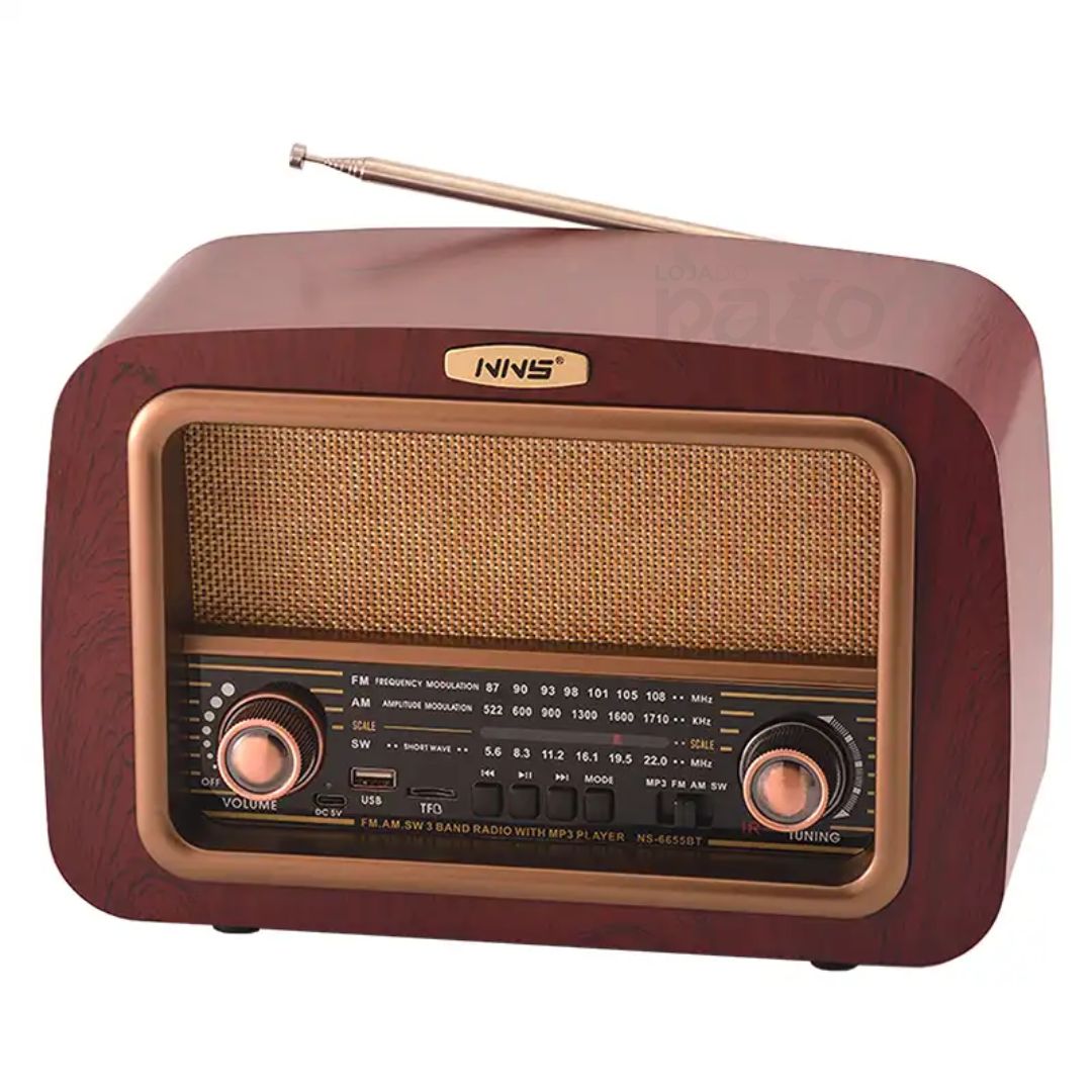 O Rádio Retro BT Recarregável – NS-6655BT foi desenvolvido para quem valoriza som de qualidade, versatilidade e autonomia.