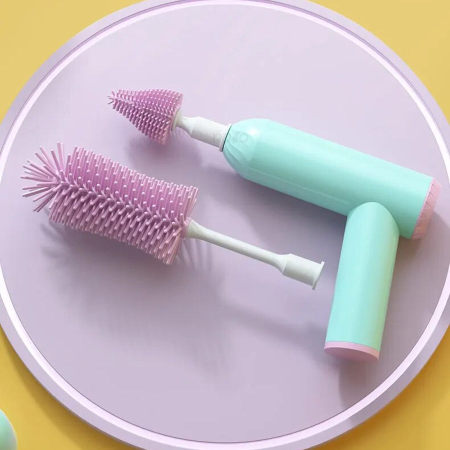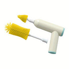 Contém dois tipos de escovas de forma a conseguir o corpo inteiro das garrafas ou biberões e ainda outra escova para limpar zonas mais estreitas, ranhuras e cantos profundos.