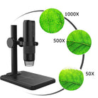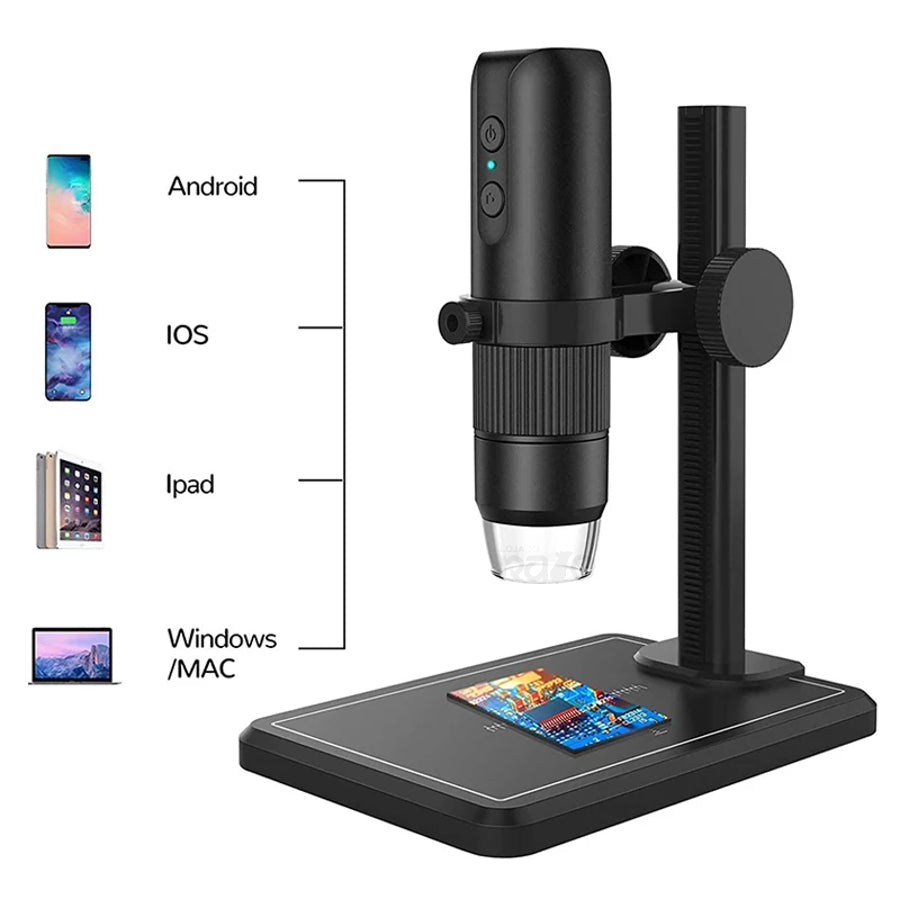 Compacto e portátil, este microscópio oferece alta ampliação e ligação sem fios para facilitar a visualização em dispositivos móveis, como smartphones, tablets e computadores. Ideal para estudantes, entusiastas, ou profissionais, permite observar texturas, insetos, eletrónica e muito mais com precisão.