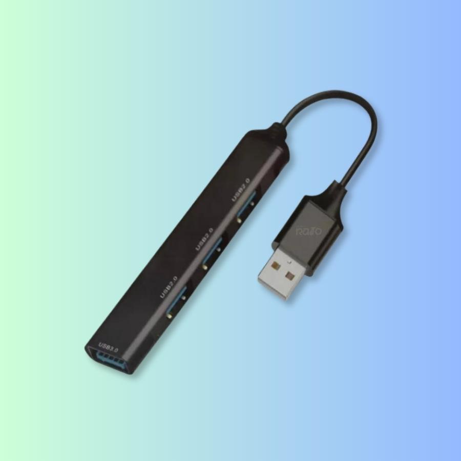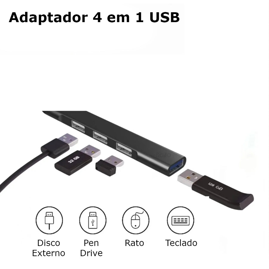 O adaptador 4 em 1, contém quatro entras USB, permitindo que ligue várias coisas ao mesmo tempo. Tem disponível com saída USB ou Tipo-C.