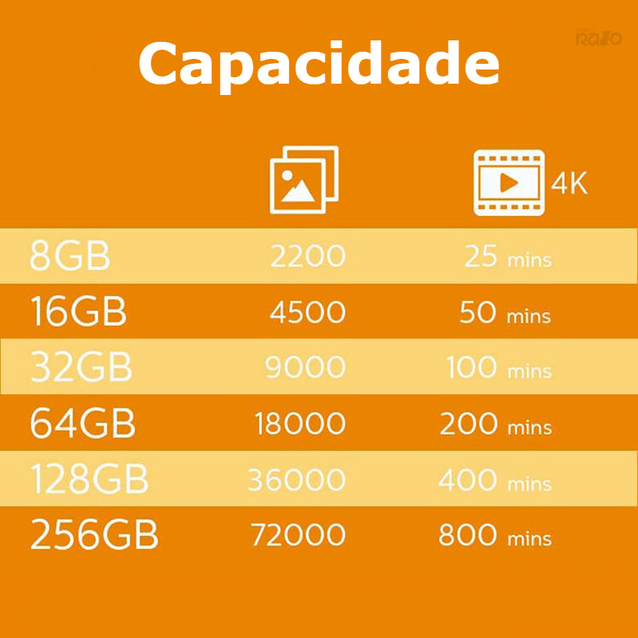 Rápida transferência de dados graças ao formato SDXC. Velocidade de leitura 80 MB/s e velocidade de gravação de 30 MB/s.