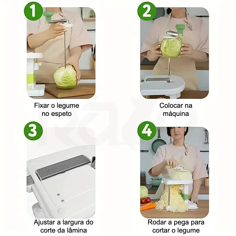 Com o cortador de legumes, basta colocar o legume no espeto, colocá-lo na máquina, regular a largura do corte da lâmina e rodar a pega para que comece a fatiar o legume em vários pedaços.