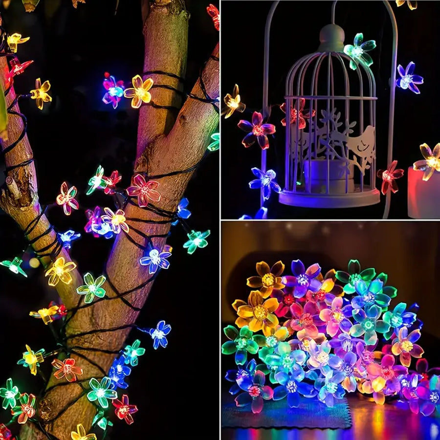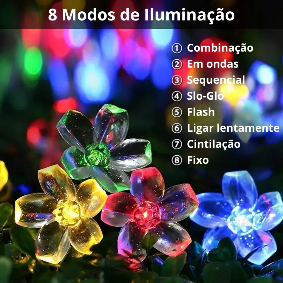 Esta grinalda é composta por LEDs em formato de flores coloridas, perfeitas para decorar jardins, varandas, eventos e festas. Alimentada a energia solar, dispensa o uso de pilhas ou cabos, oferecendo uma iluminação sustentável e económica.