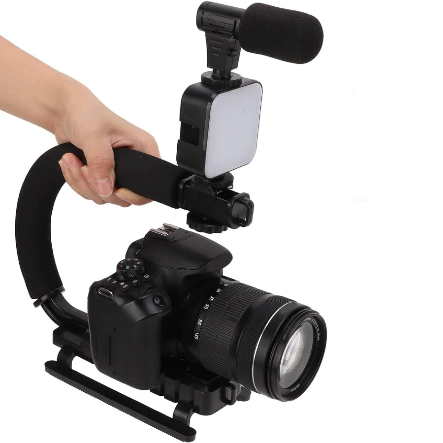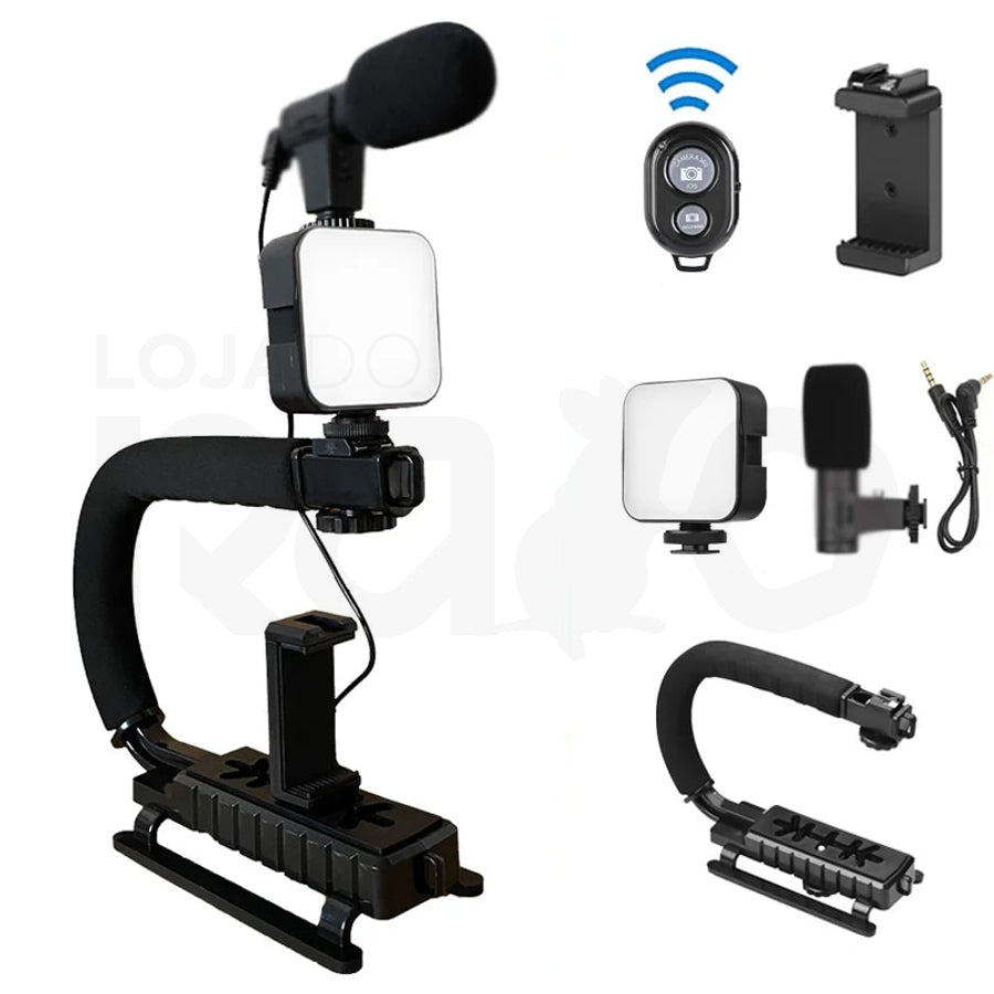 Este conjunto inclui um tripé estabilizador, um suporte para o seu telemóvel, um microfone de alta qualidade, uma luz para destacar os seus momentos, e até um comando de controlo remoto.