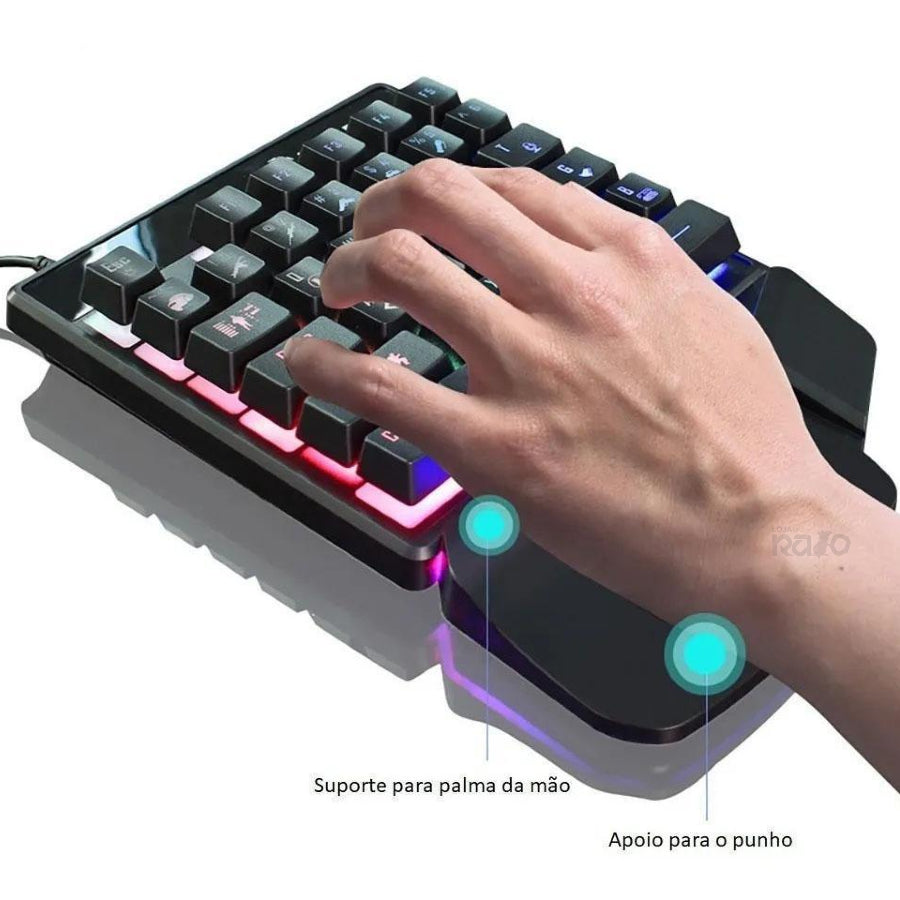 O teclado pode ser operado com apenas uma mão enquanto a outra mão está apoiada no rato.